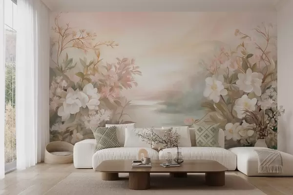 A landscape with a river surrounded by flowers and plants, soft colors, pink sky, watercolor textured style - Wall mural (No. w09537)