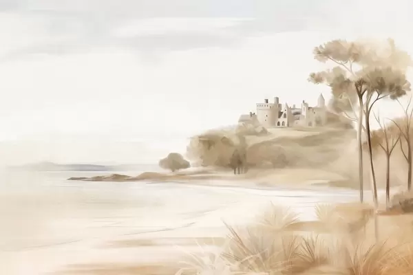 wall murals Landscape with a castle on a hill near the sea, a sandy beach in the foreground, muted colors, textured art w09540