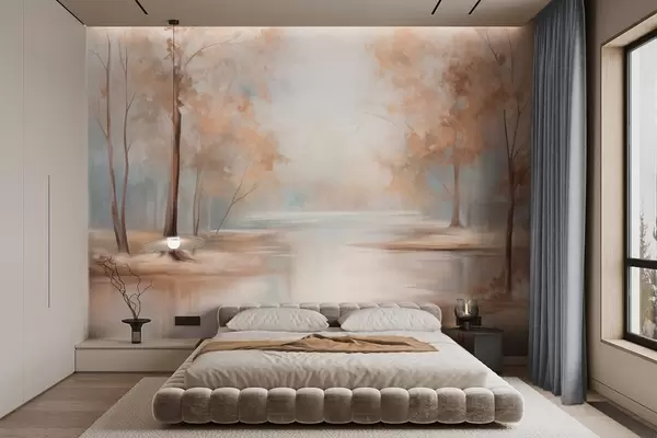 Autumn textured landscape with trees and a river, soft colors, light and airy atmosphere, peaceful and tranquil scene - Wall mural (No. w09541)