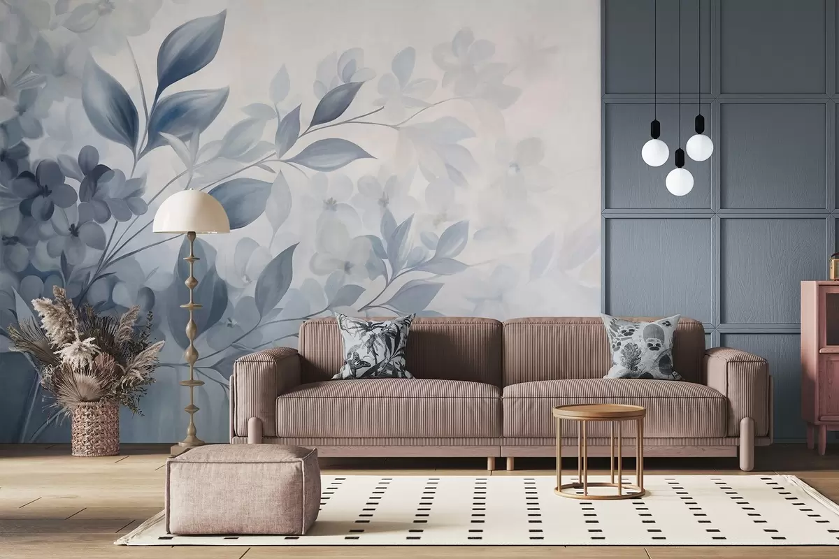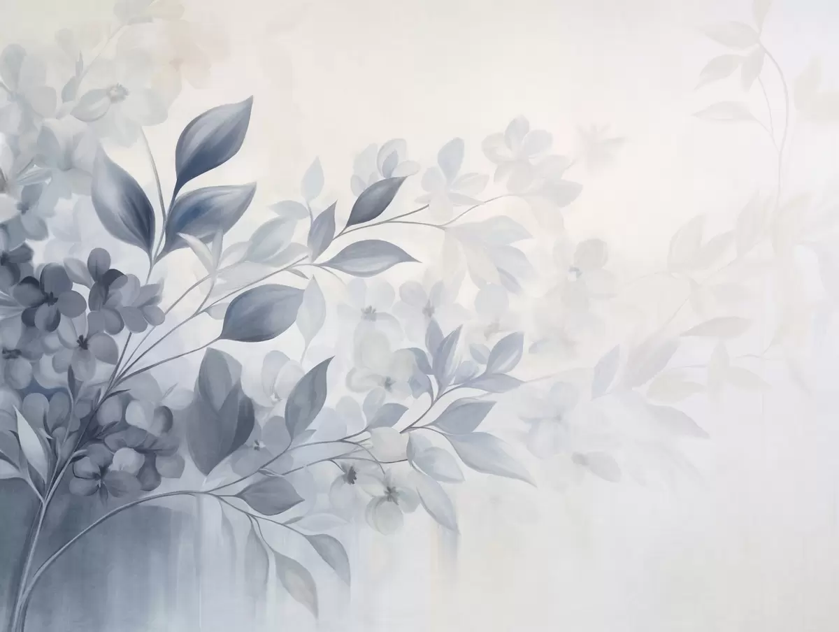 Textured blue and white branch with flowers and leaves fading into a light background watercolor painting style - Wall mural (No. w09543)
