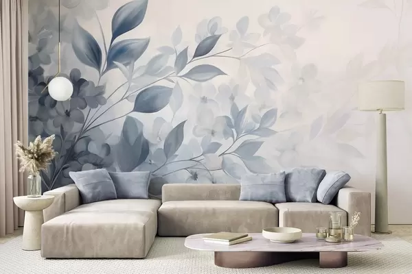 Textured blue and white branch with flowers and leaves fading into a light background watercolor painting style - Wall mural (No. w09543)