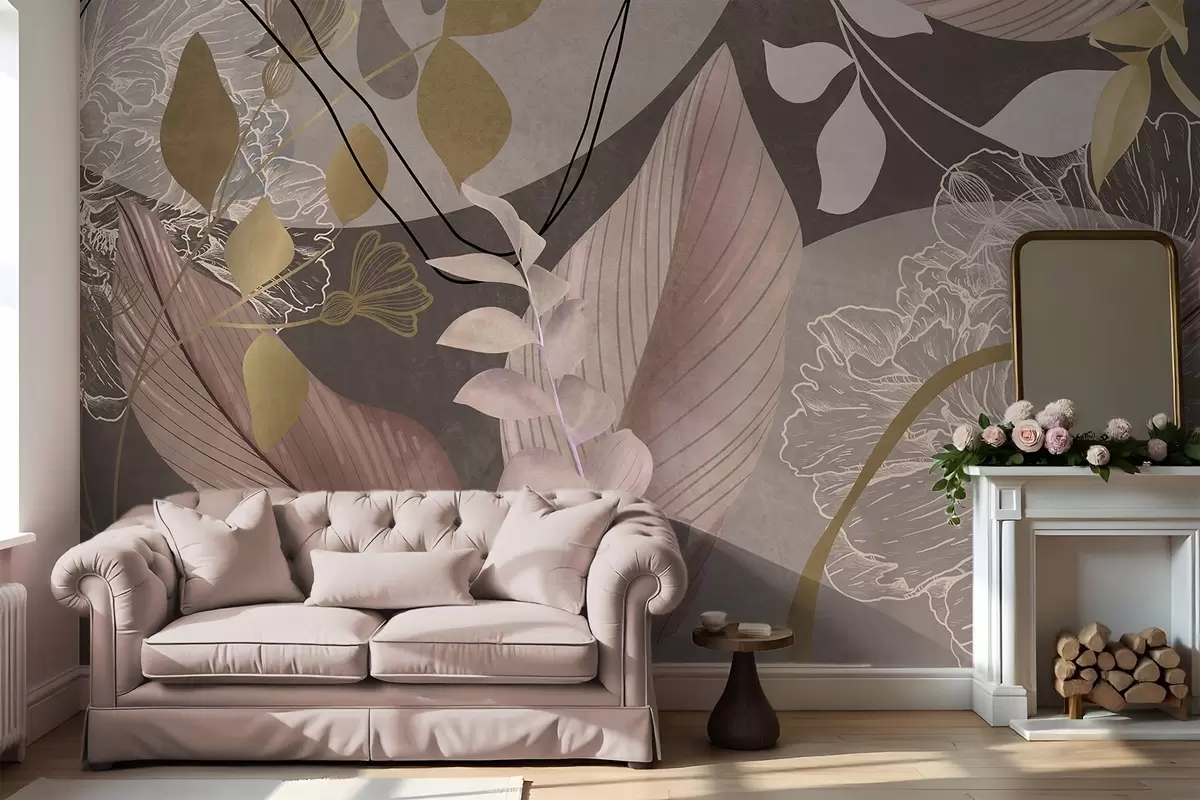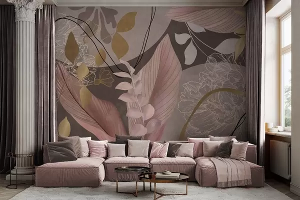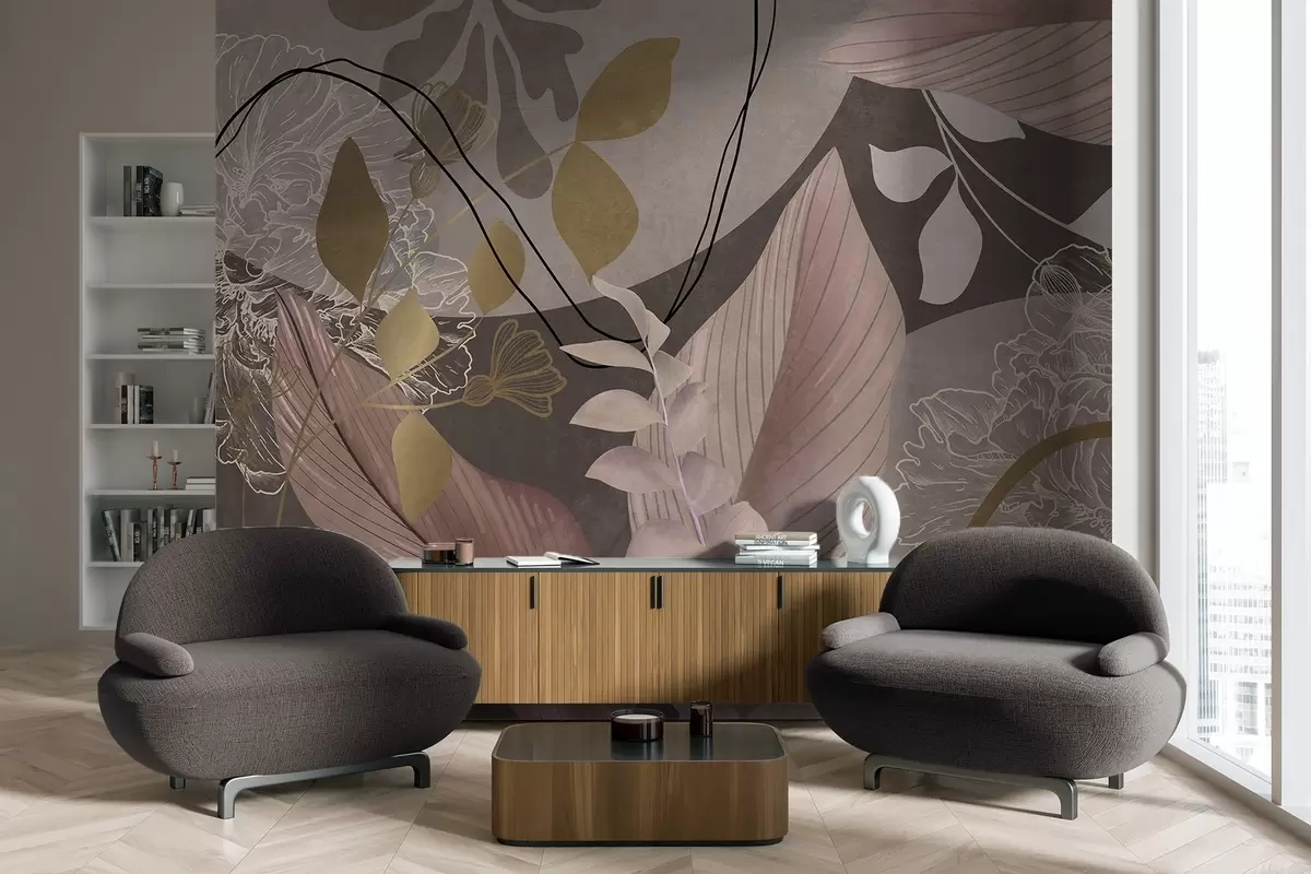 Abstract floral print with large leaves in shades of muted pink and brown with thin black lines and white floral outlines - Wall mural (No. w09544)