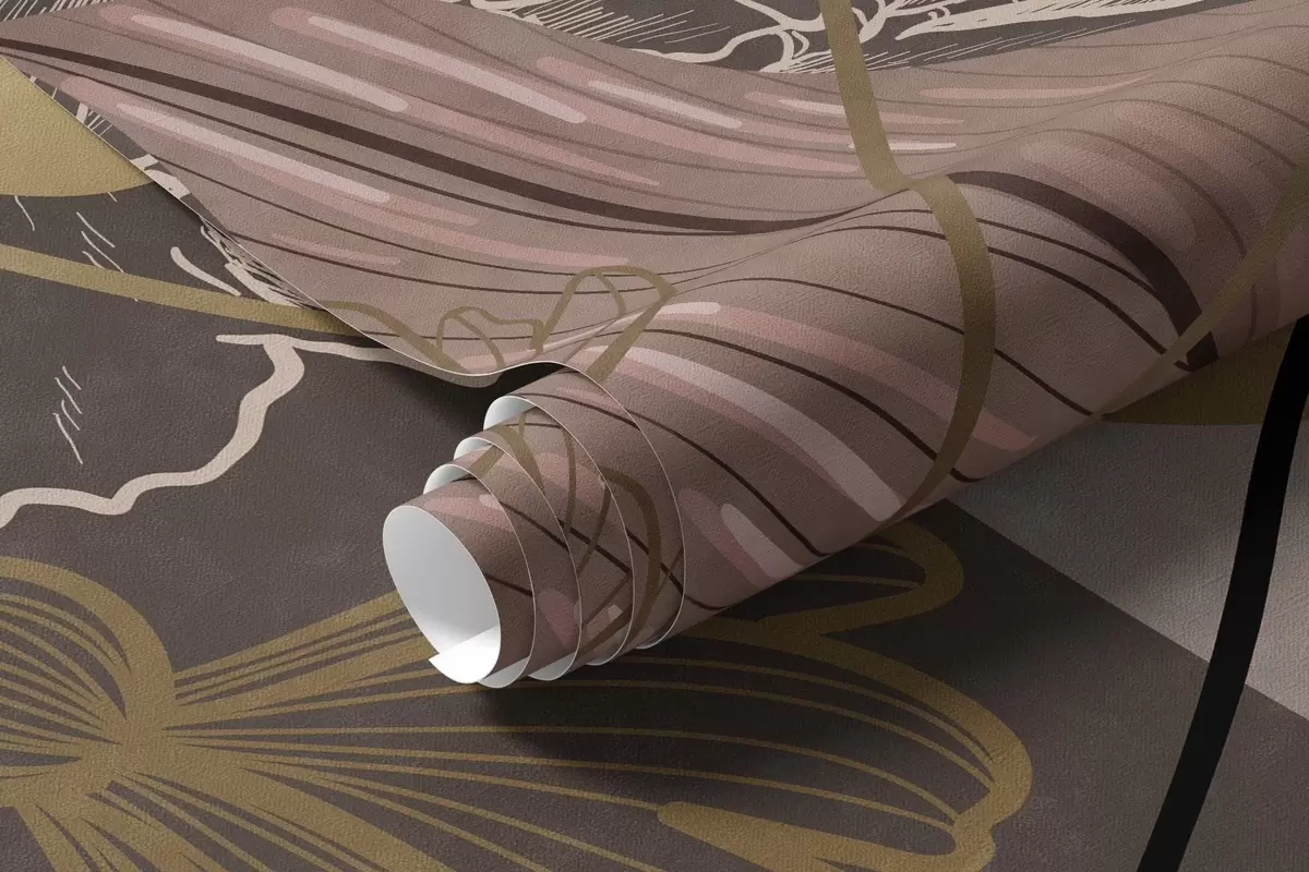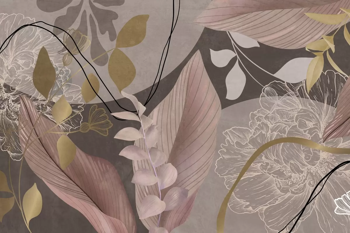 Abstract floral print with large leaves in shades of muted pink and brown with thin black lines and white floral outlines - Wall mural (No. w09544)
