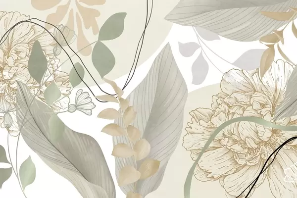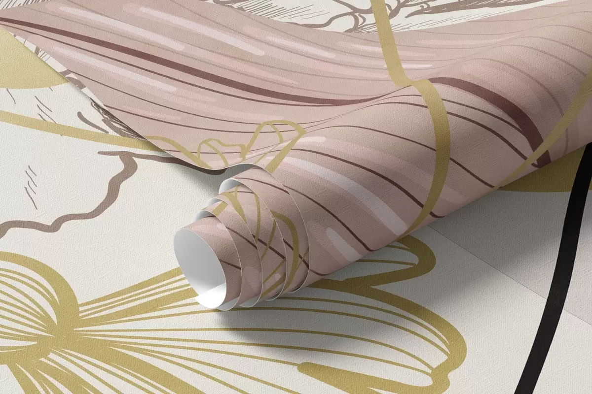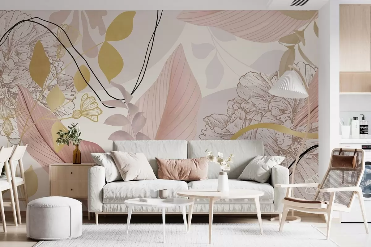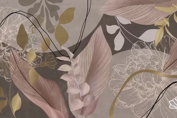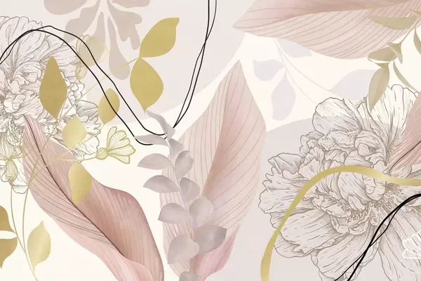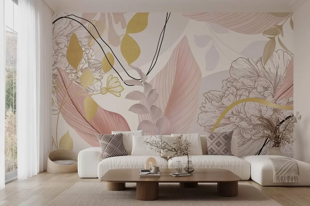 Abstract floral print with large leaves in shades of muted pink, yellow with thin black lines and white floral outlines - Wall mural (No. w09544v1)