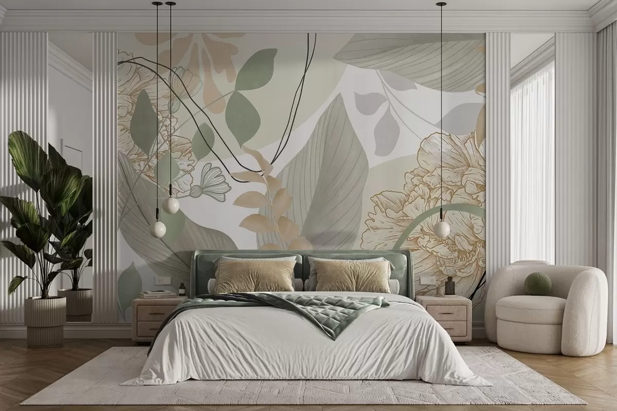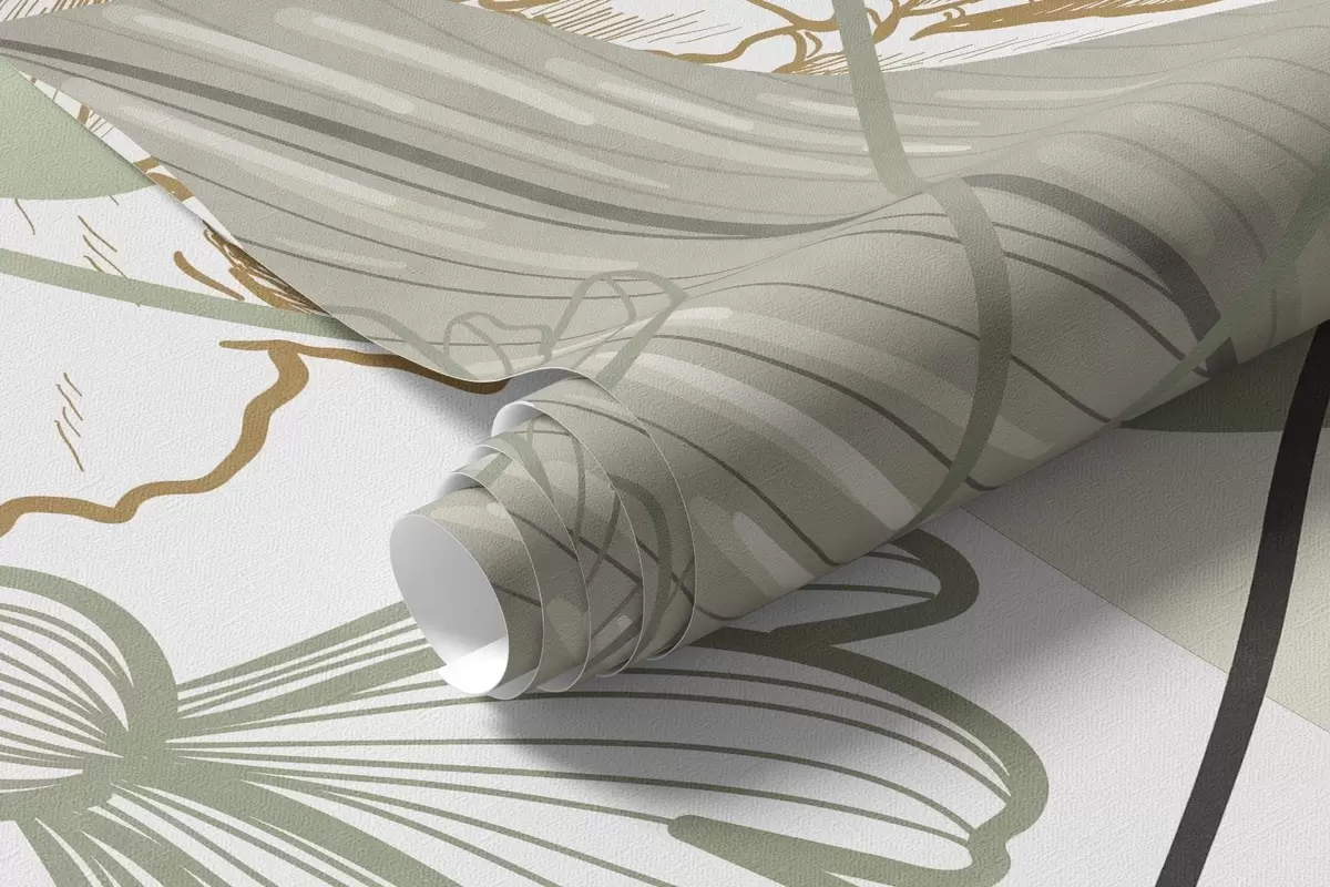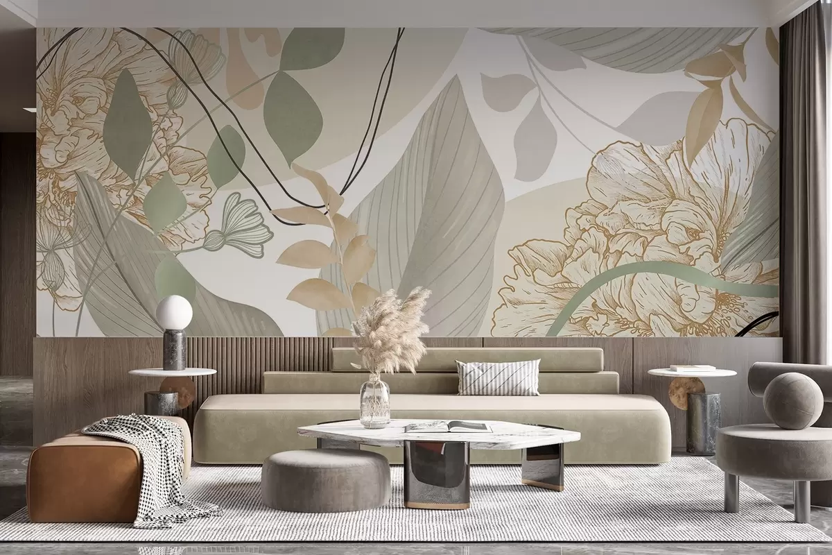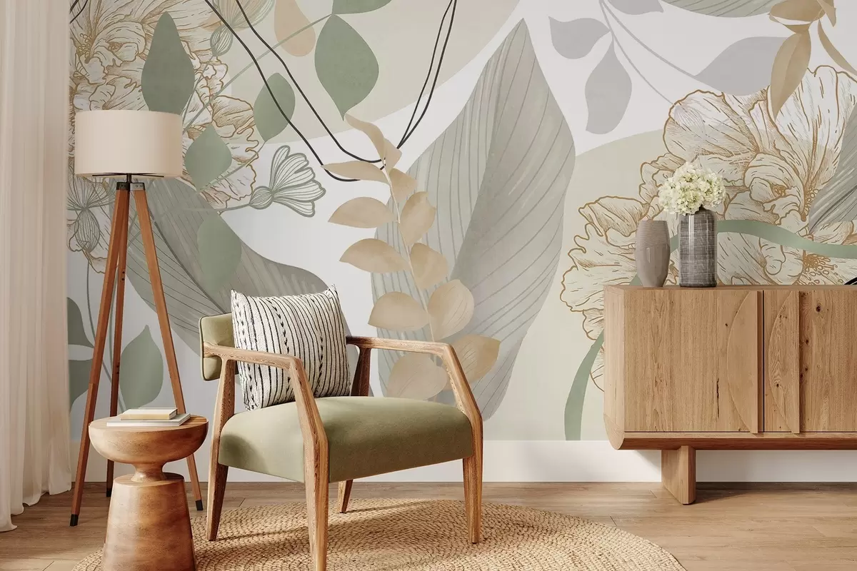 Abstract floral print with large leaves in shades of muted green and yellow with thin black lines and white floral outlines - Wall mural (No. w09544v2)