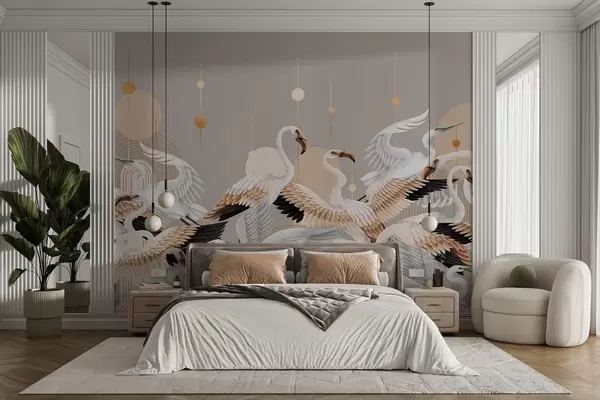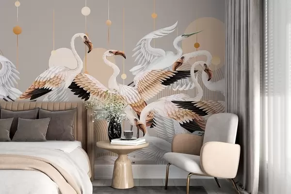 A flock of white flamingos with delicate wings, against a neutral background with yellow lines and circles - Wall mural (No. w09546v1)