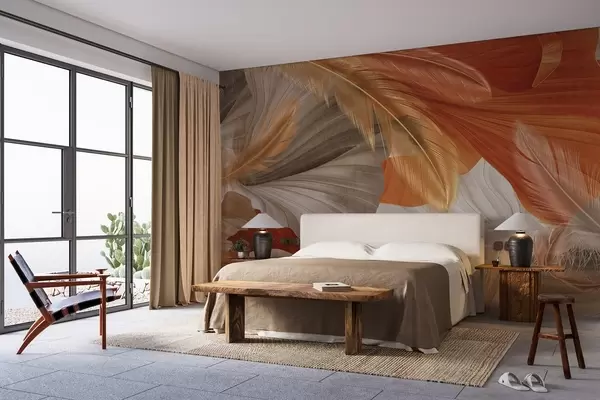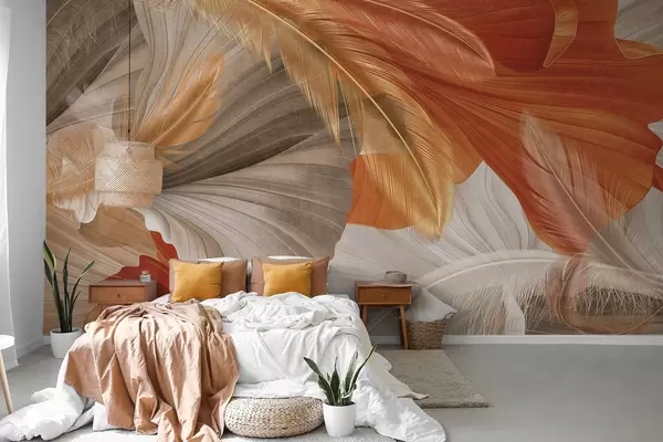 Abstract textured large flowing shapes in cream and rust colors with delicate, yellow, beige and brown feathers - Wall mural (No. w09549)