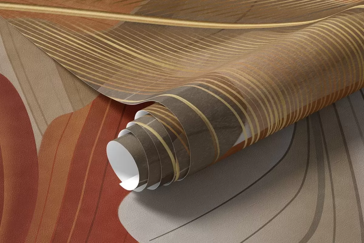 Abstract textured large flowing shapes in cream and rust colors with delicate, yellow, beige and brown feathers - Wall mural (No. w09549)