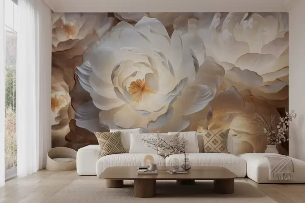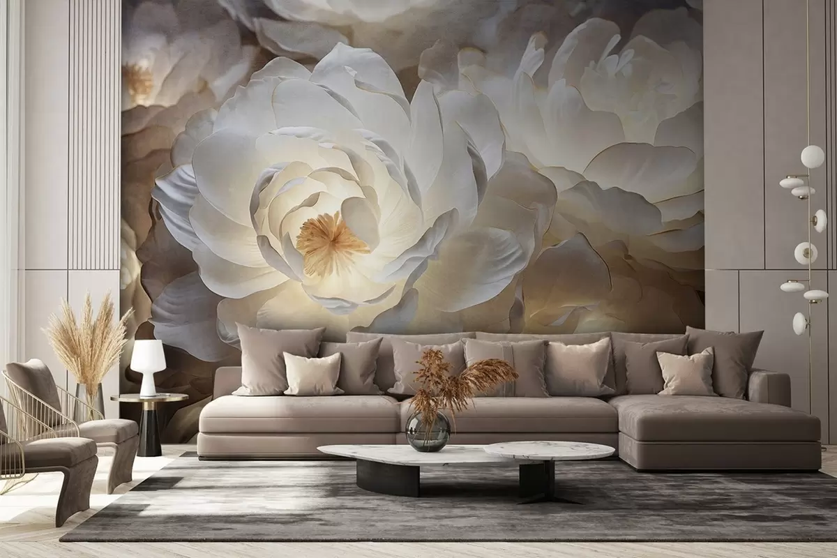 Large, white fantasy peony flowers with yellow centers, soft lighting, and delicate, textured layered petals - Wall mural (No. w09550)