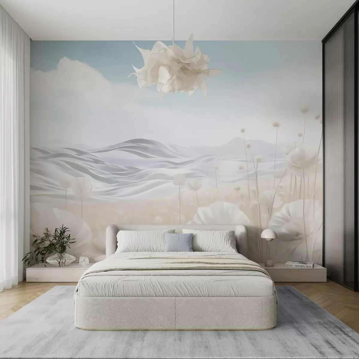 wall murals Textured field of creamy poppies with rolling hills under a pale blue sky with soft clouds, pastel colors w09553