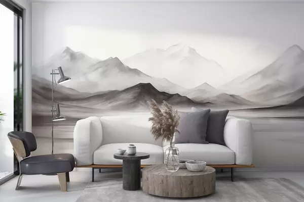 A monochromatic textured landscape with misty mountains and a lake in the foreground - Wall mural (No. w09555)