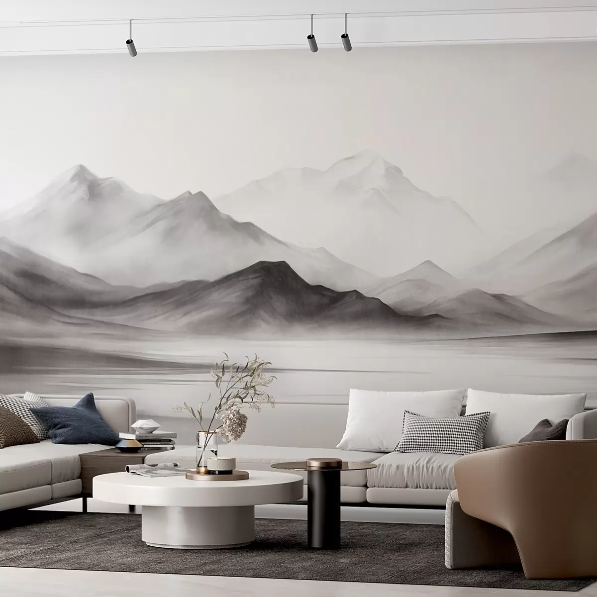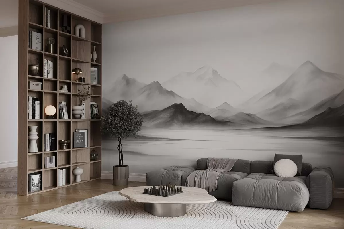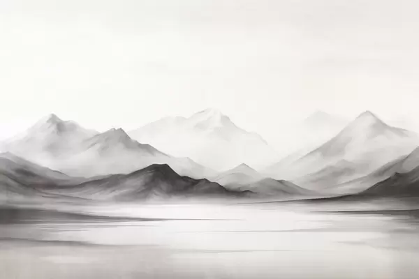 A monochromatic textured landscape with misty mountains and a lake in the foreground - Wall mural (No. w09555)