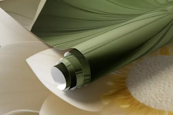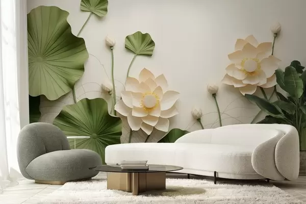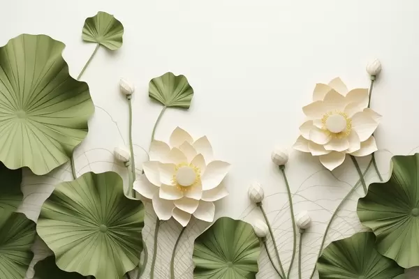 3d lotus flowers with green textured leaves, minimalist style - Wall mural (No. w09560)