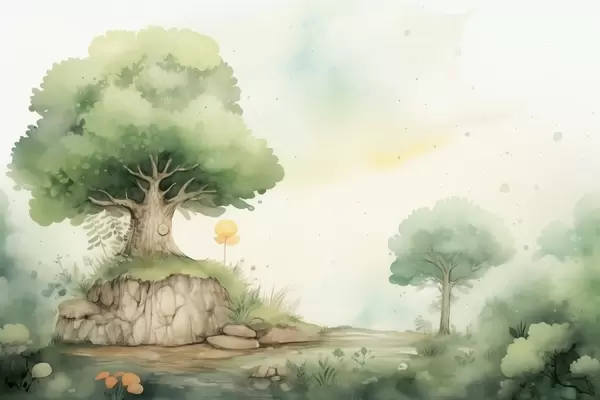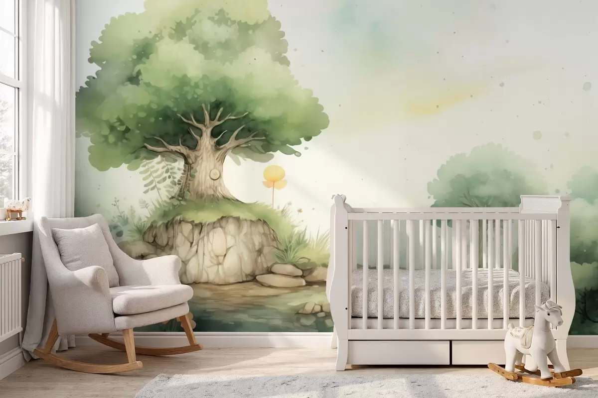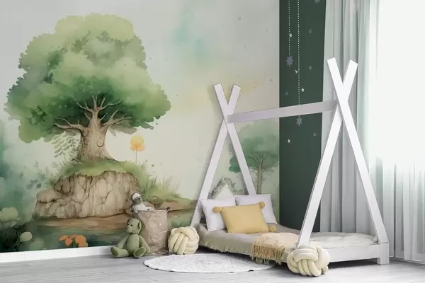 A fairytale world of childhood in a green forest landscape, watercolor style - Wall mural (No. w09566)