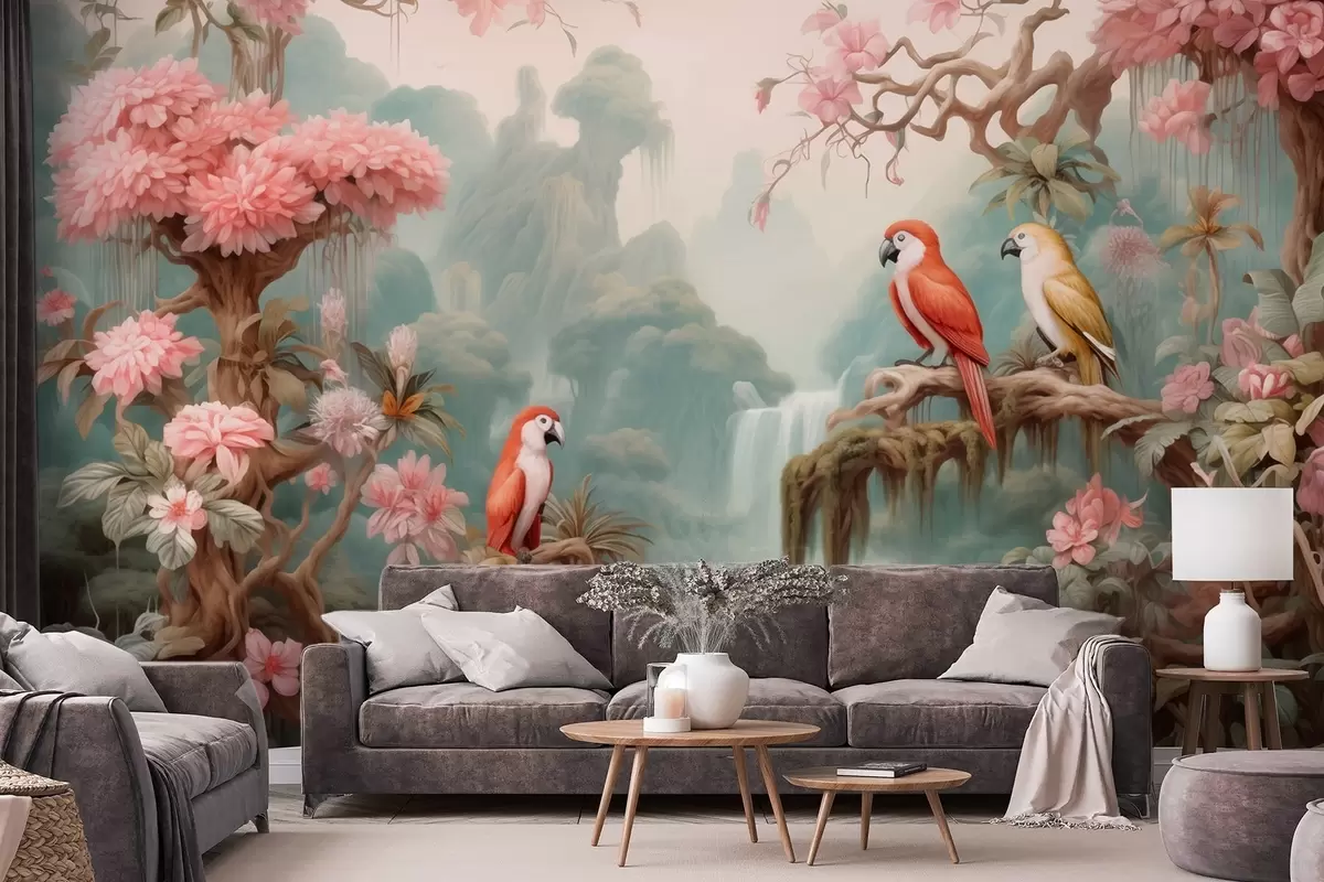 A fairytale tropical forest with parrots, flowering trees with pink blossoms, and a waterfall - Wall mural (No. w09580)