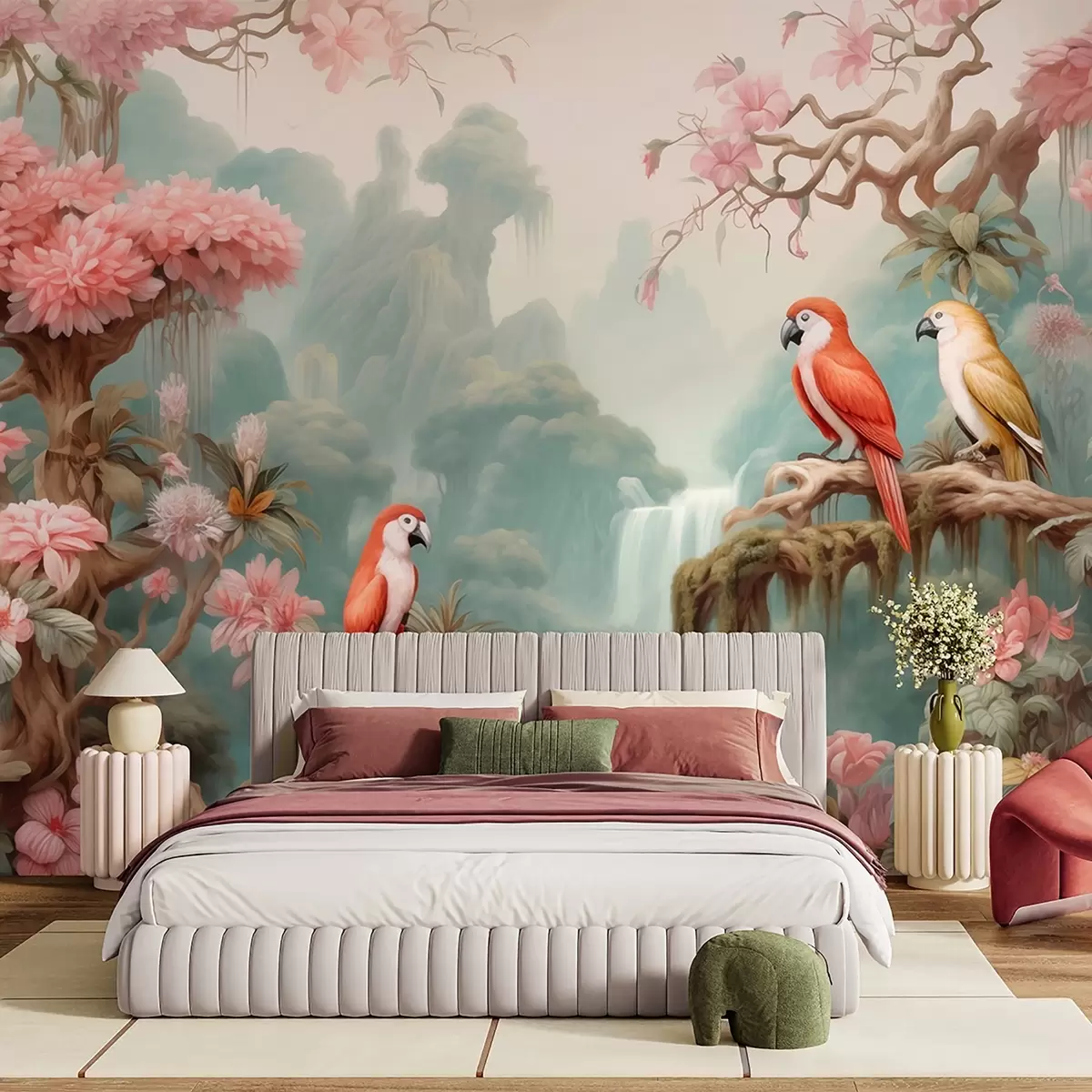 A fairytale tropical forest with parrots, flowering trees with pink blossoms, and a waterfall - Wall mural (No. w09580)
