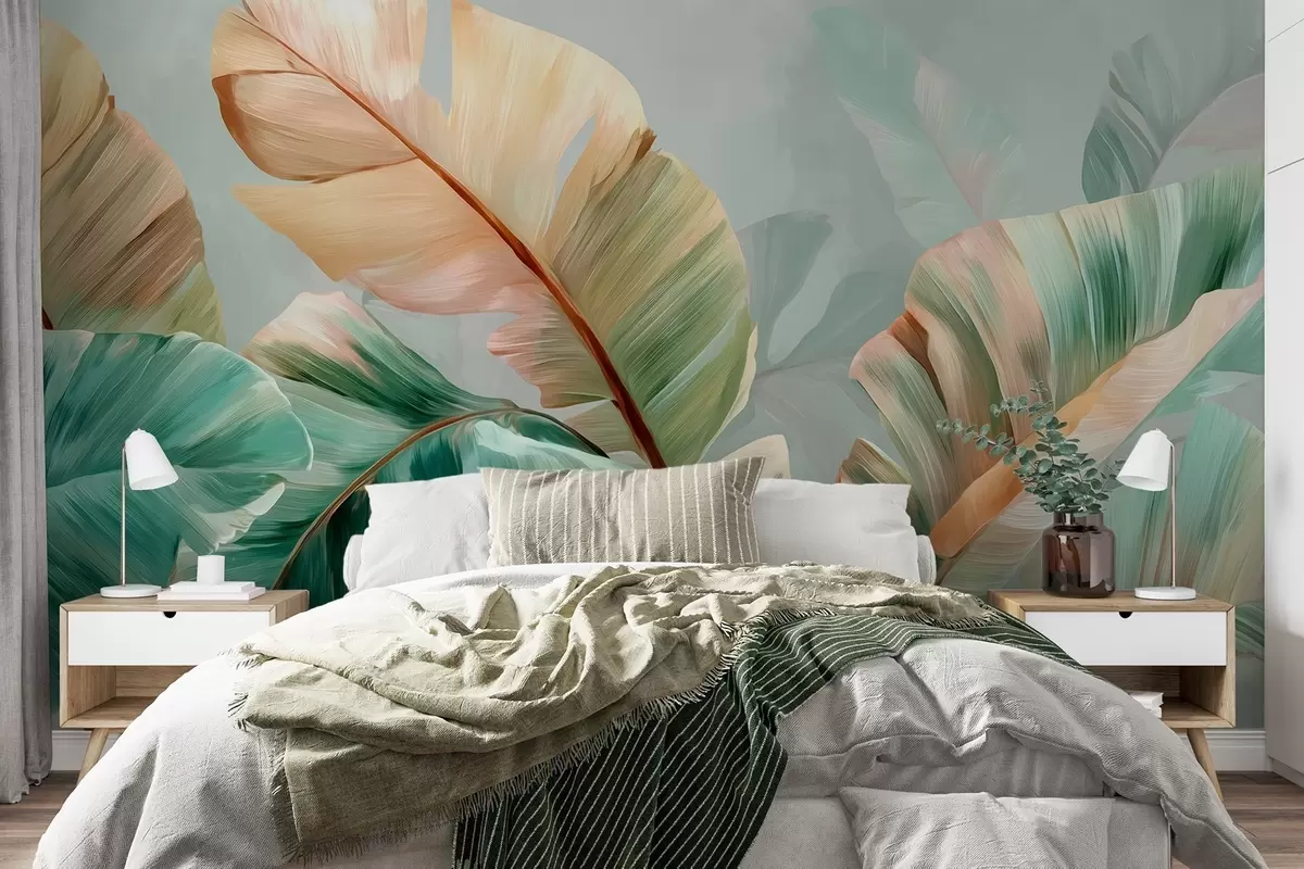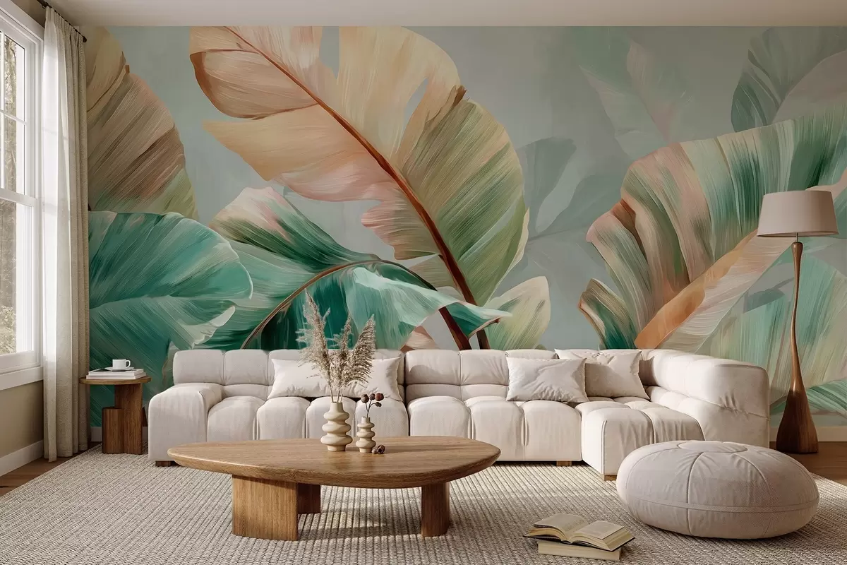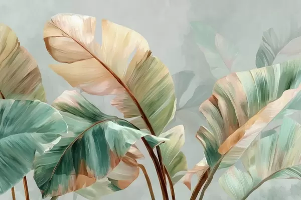 Delicate tropical banana leaves in pastel yellow-green tones - Wall mural (No. w09581)