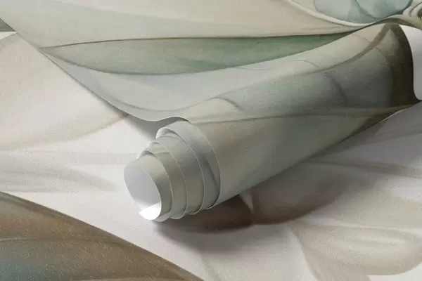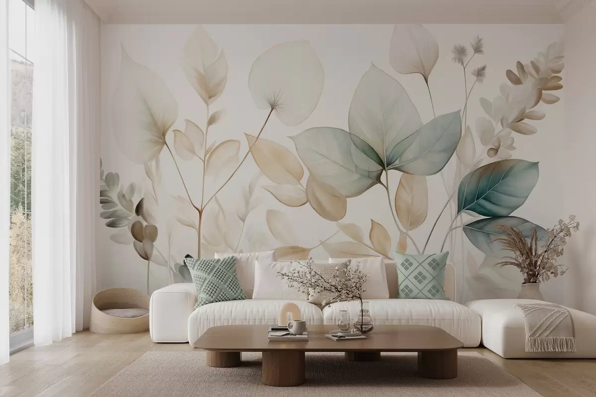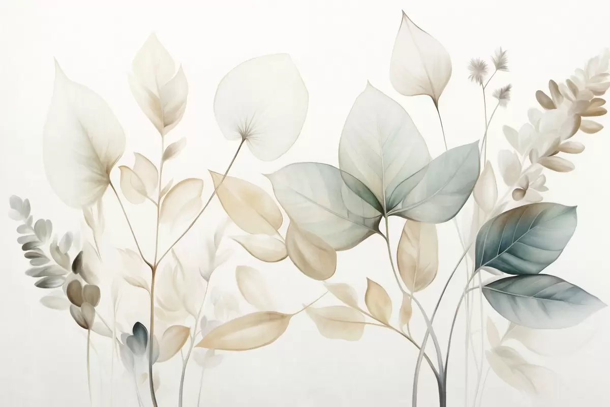 Textured translucent leaves in muted tones of beige and teal, with delicate stems against a soft, light background - Wall mural (No. w09583)