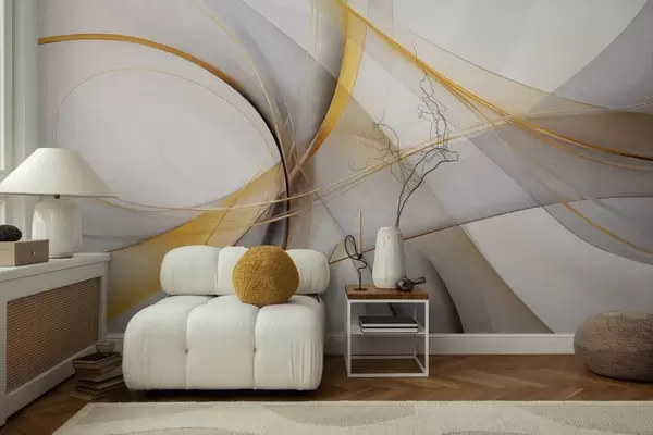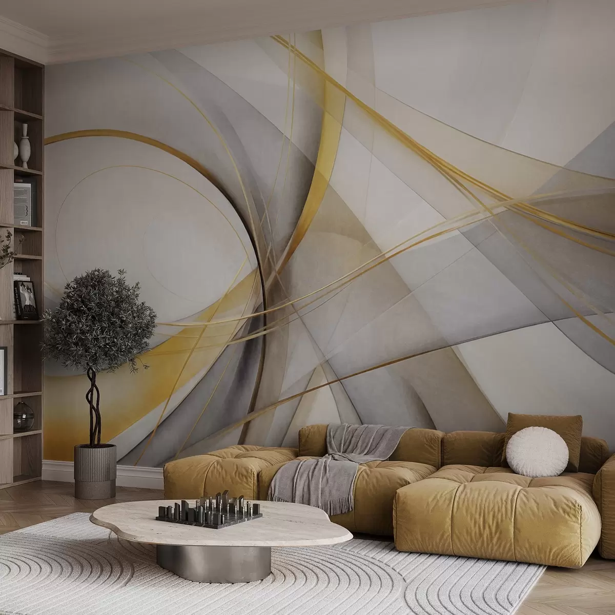 Abstract flowing lines in yellow and white on a gray background, with a sense of movement and depth, modern art - Wall mural (No. w09587)