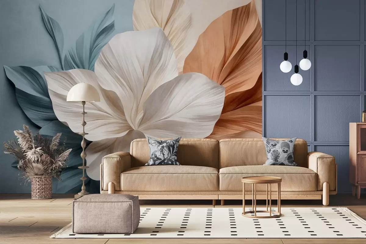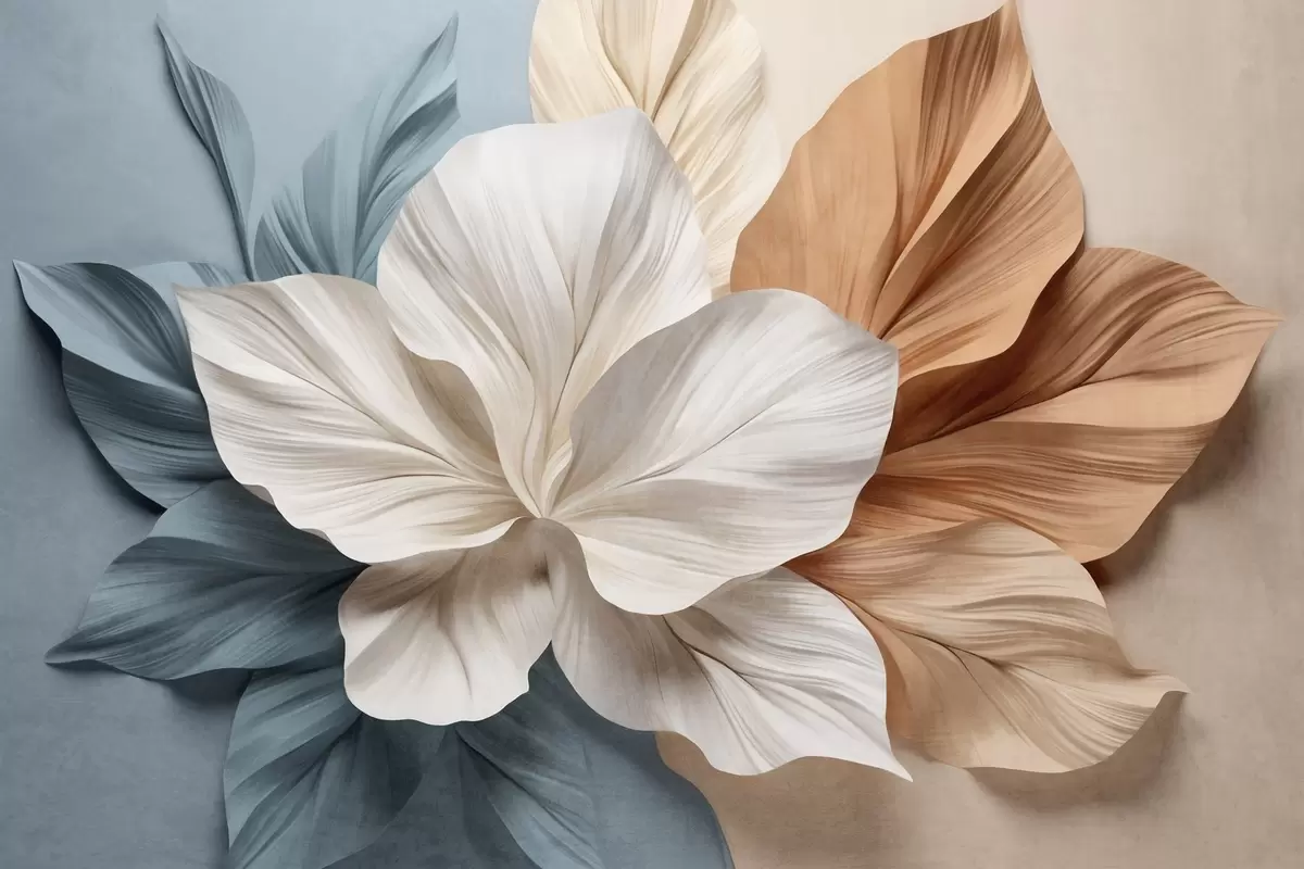 wall murals Abstract multi-petaled flower with textured leaves in shades of peach and blue, soft background w09604