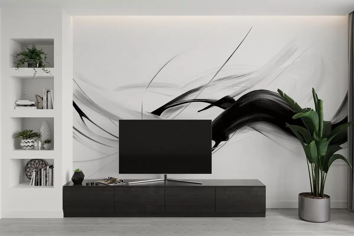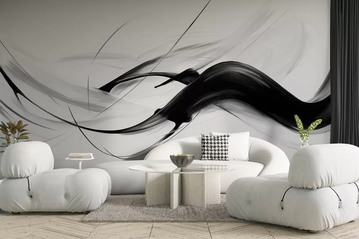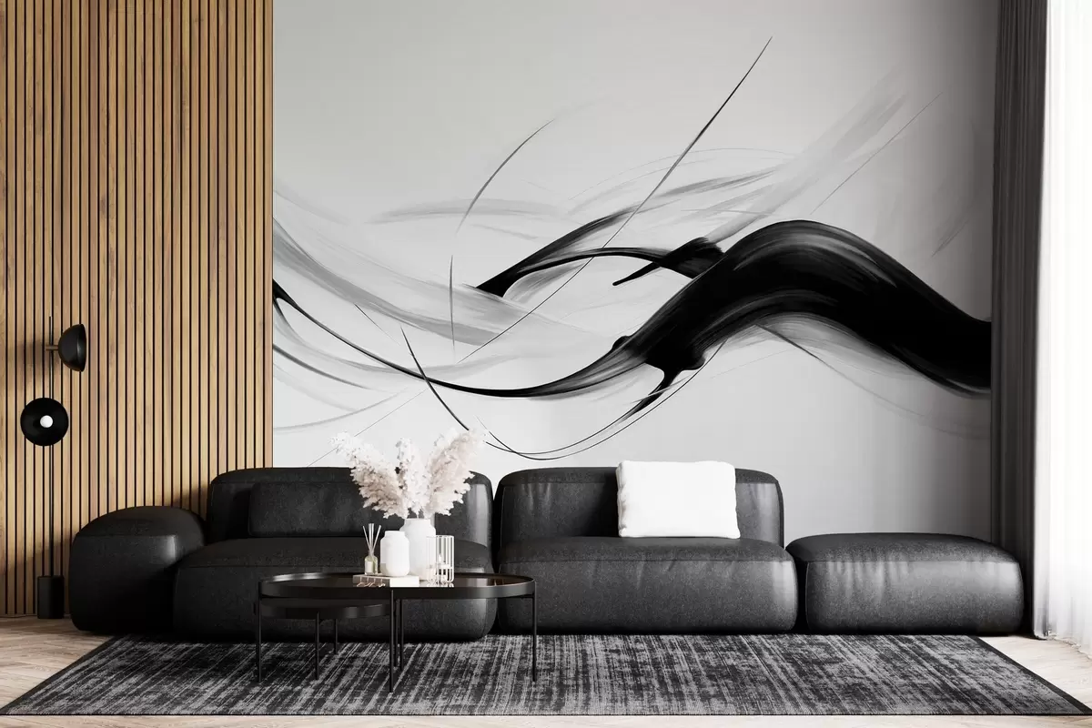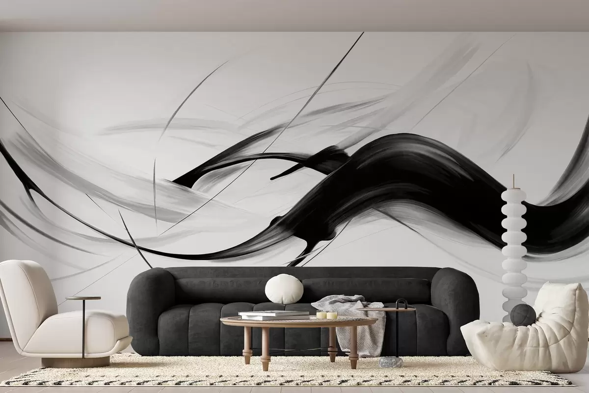 Abstract black and white brush strokes with thin lines creating a modern design against light background - Wall mural (No. w09605)