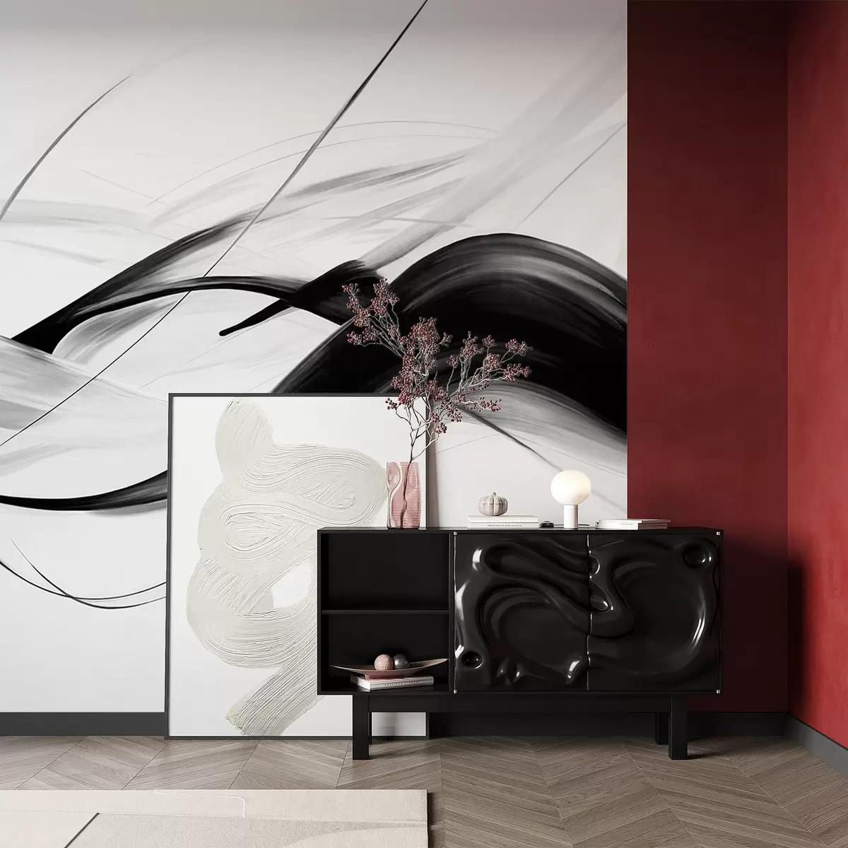 Abstract black and white brush strokes with thin lines creating a modern design against light background - Wall mural (No. w09605)