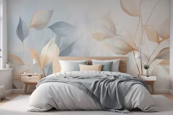 A soft, delicate, translucent leaves in muted tones of beige, peach, and pale blue, textured pastel art - Wall mural (No. w09607)