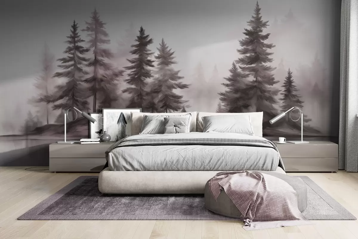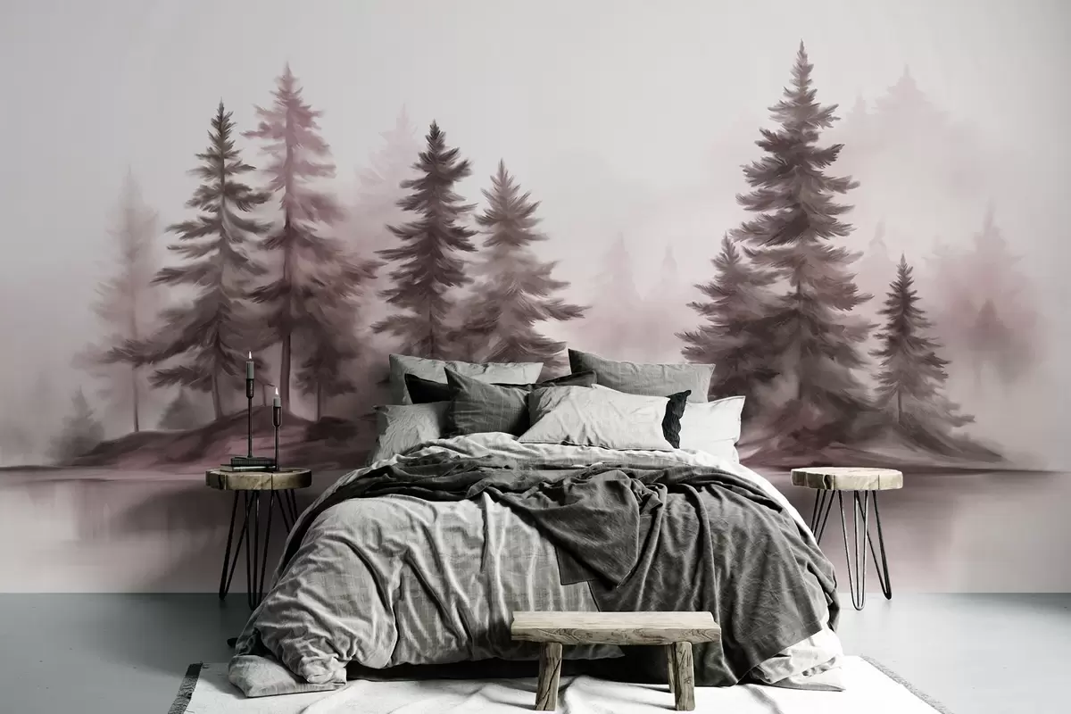 A textured foggy forest with tall pine trees painting imitation - Wall mural (No. w09610v1)
