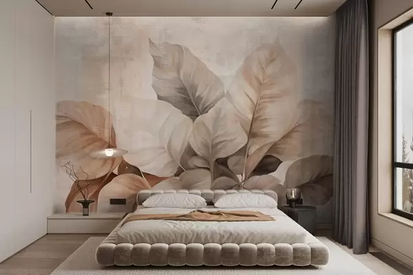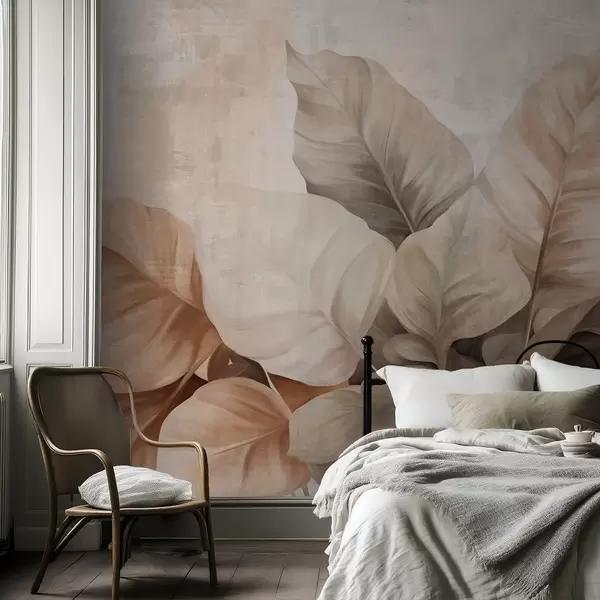 Textured painting imitation of large, light brown leaves against a neutral background with subtle brushstrokes - Wall mural (No. w09614)