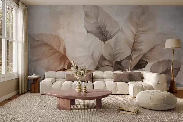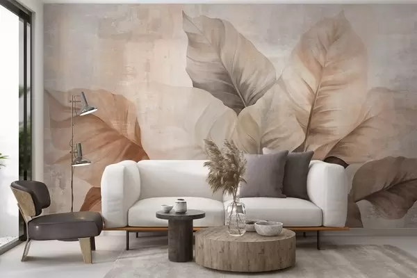 Textured painting imitation of large, light brown leaves against a neutral background with subtle brushstrokes - Wall mural (No. w09614)