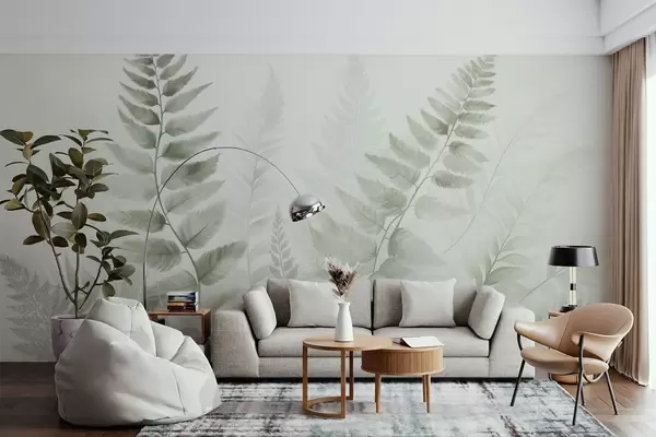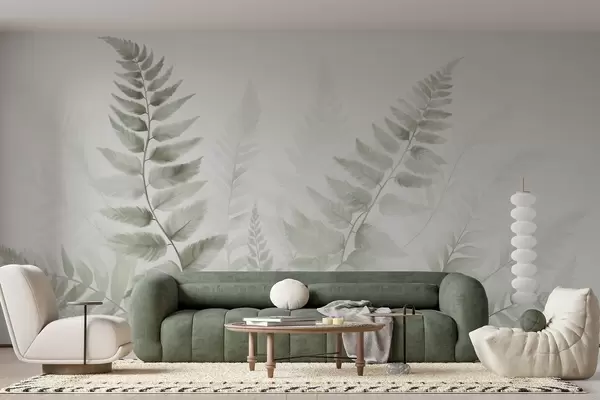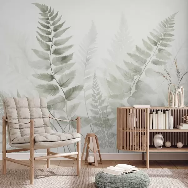 Textured dried fern fronds in various shades of green, with a soft, light background in watercolor style - Wall mural (No. w09615v1)