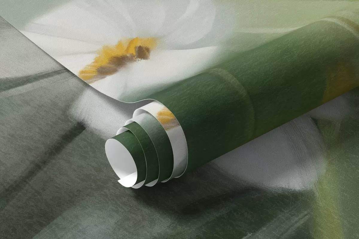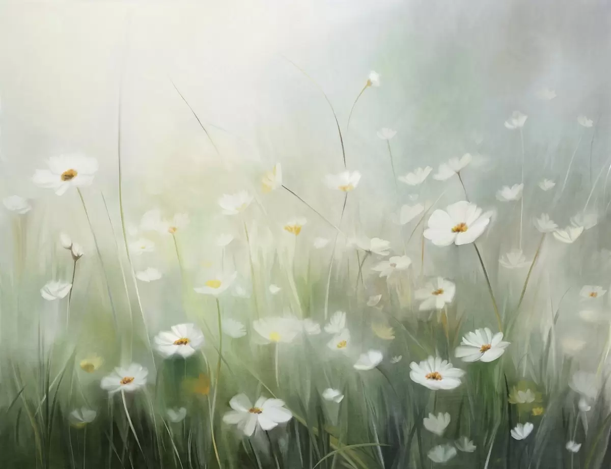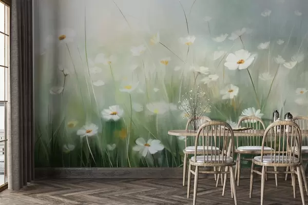Abstract field of white daisies with green grass and a soft, hazy background in painting style - Wall mural (No. w09619)