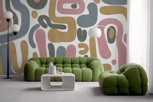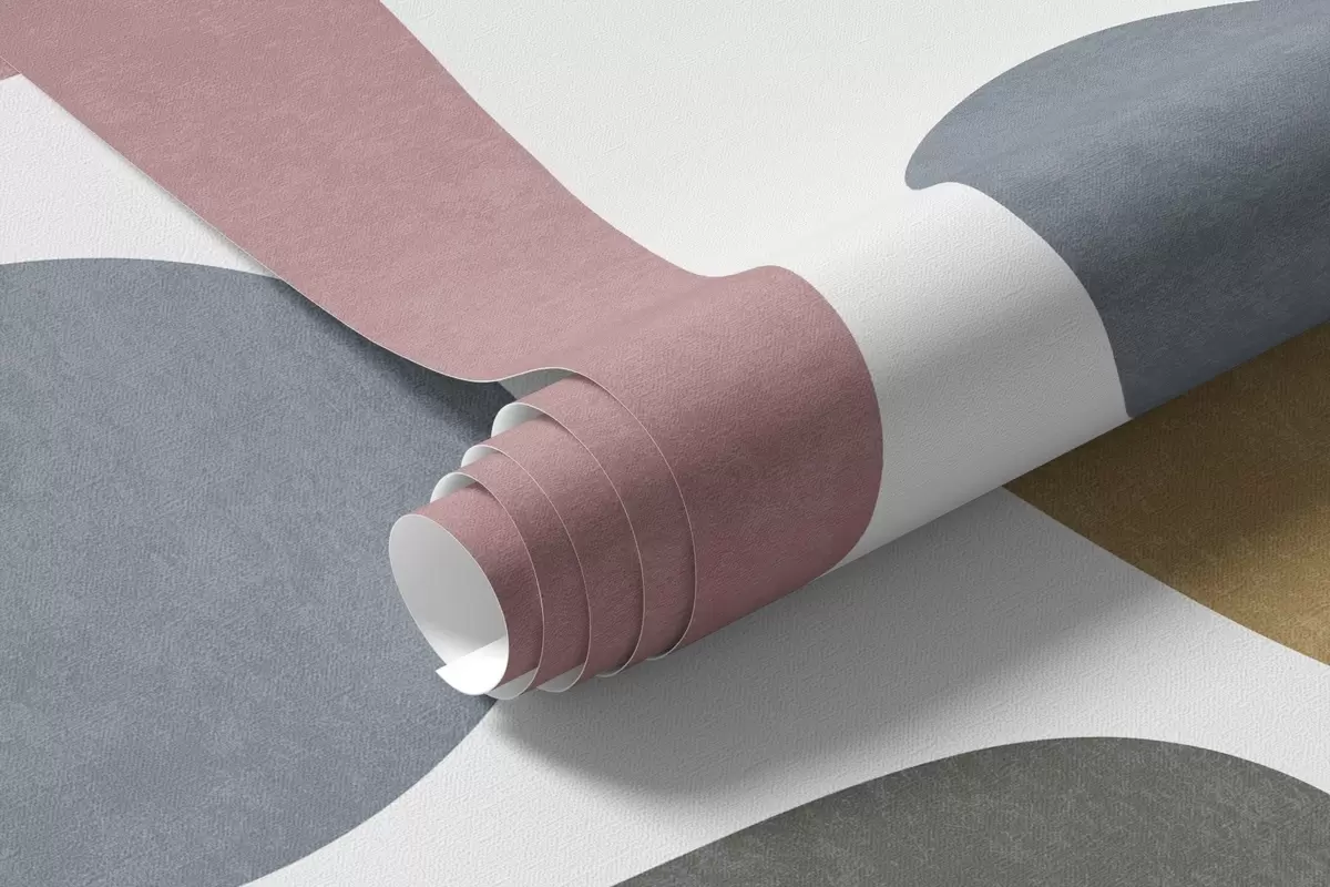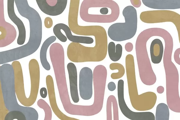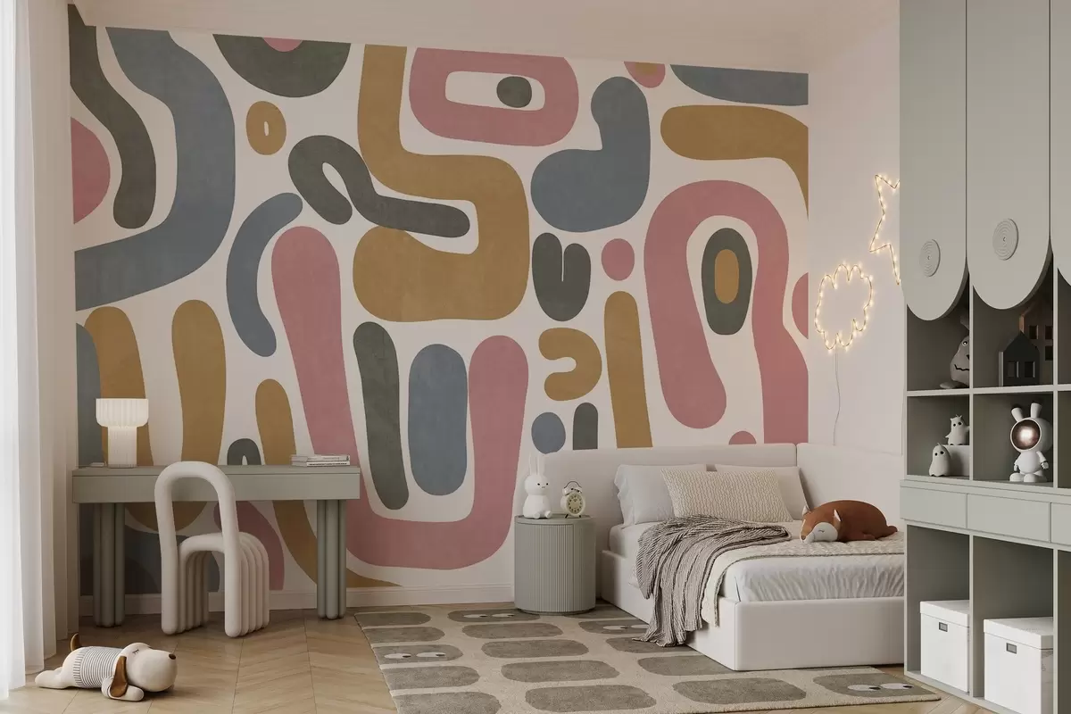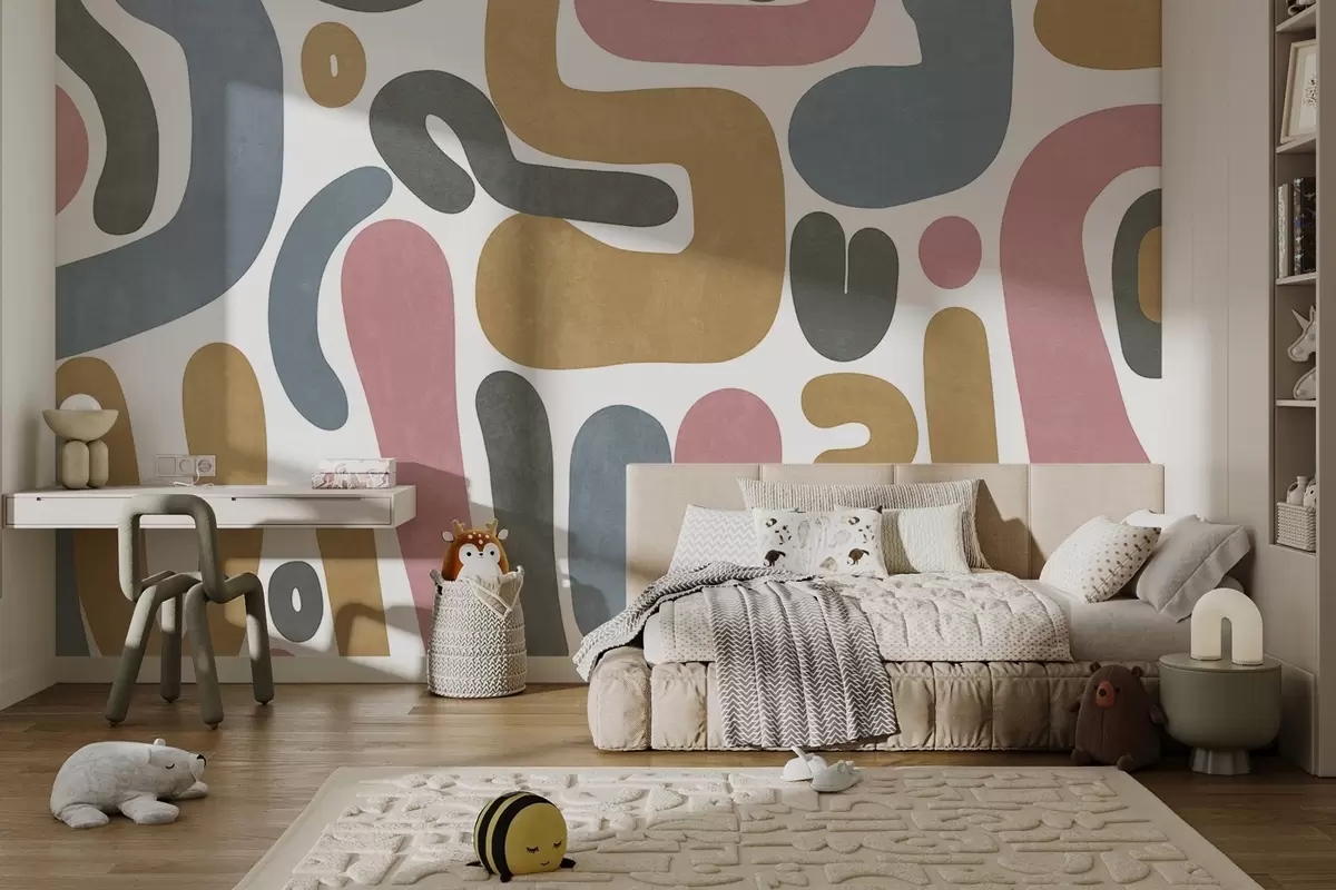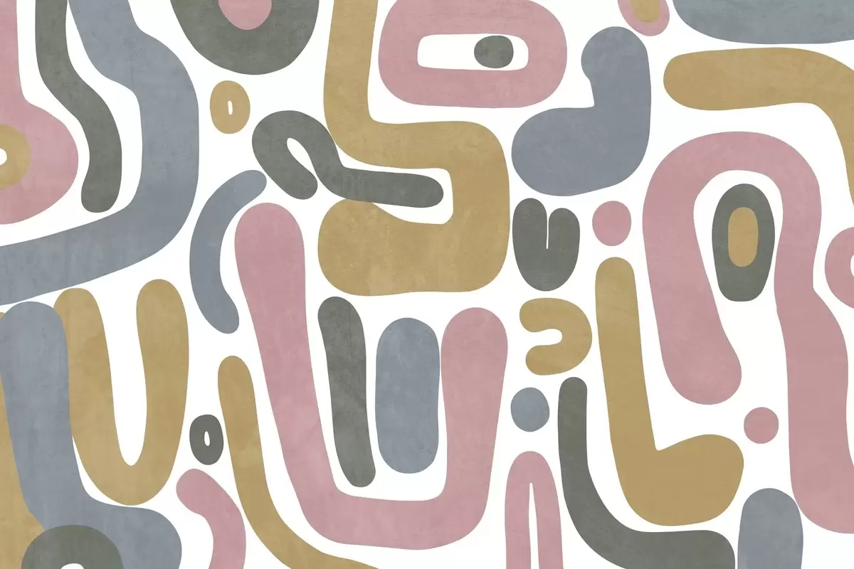 Abstract textured shapes in pastel pink, muted blue, mustard yellow and grey on a white background modern art - Wall mural (No. w09620)