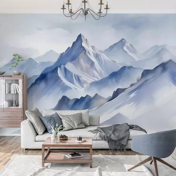 Textured snowy mountains with a soft, watercolor effect and a palette of blue and white - Wall mural (No. w09630)
