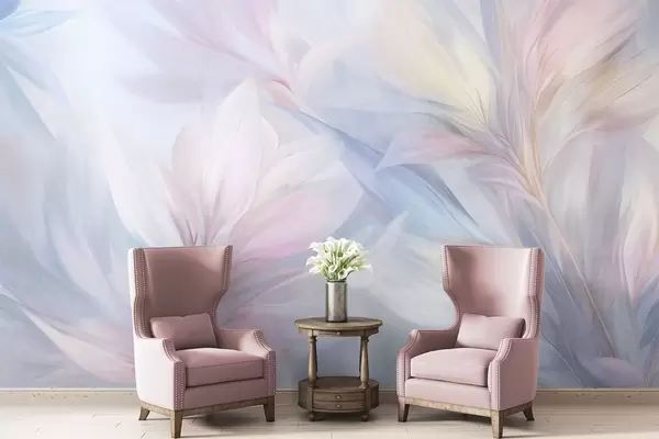 Soft, pastel-colored leaves and feathers in shades of pink, blue and yellow, abstract and textured print - Wall mural (No. w09634)