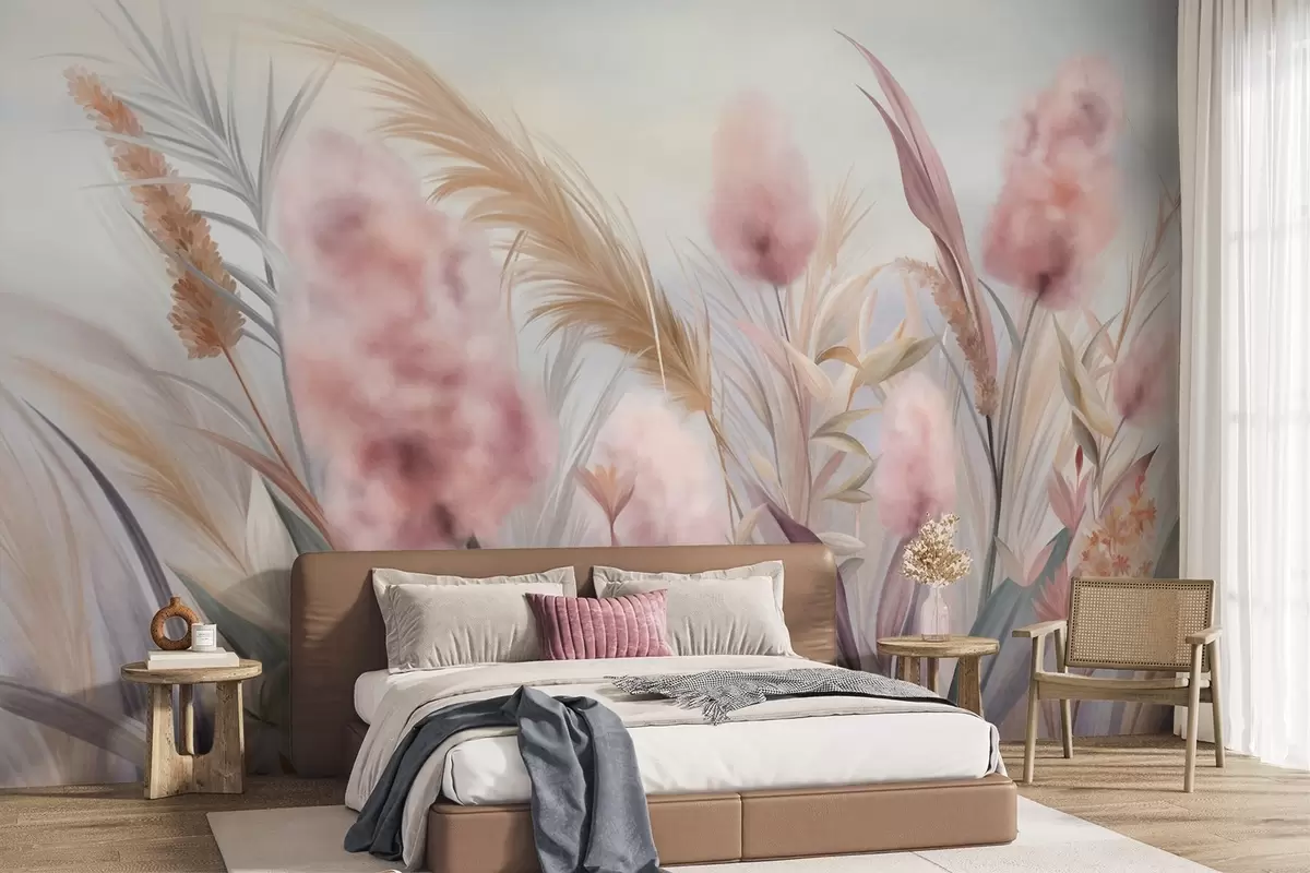 Pink and beige pampas grass and other dried flowers with a soft, hazy sky in the background - Wall mural (No. w09635)