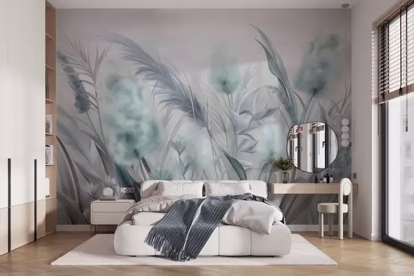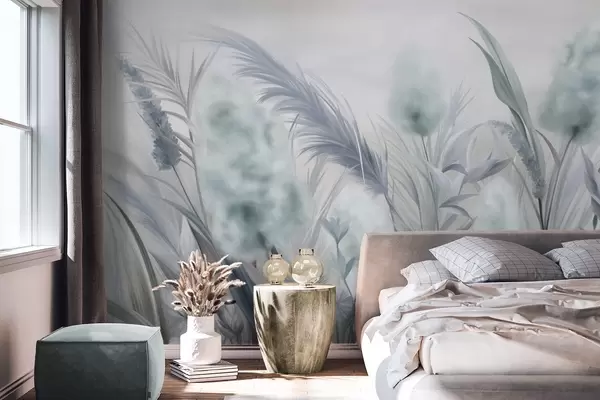 Blue and gray pampas grass and other dried flowers with a soft, hazy sky in the background - Wall mural (No. w09635v1)