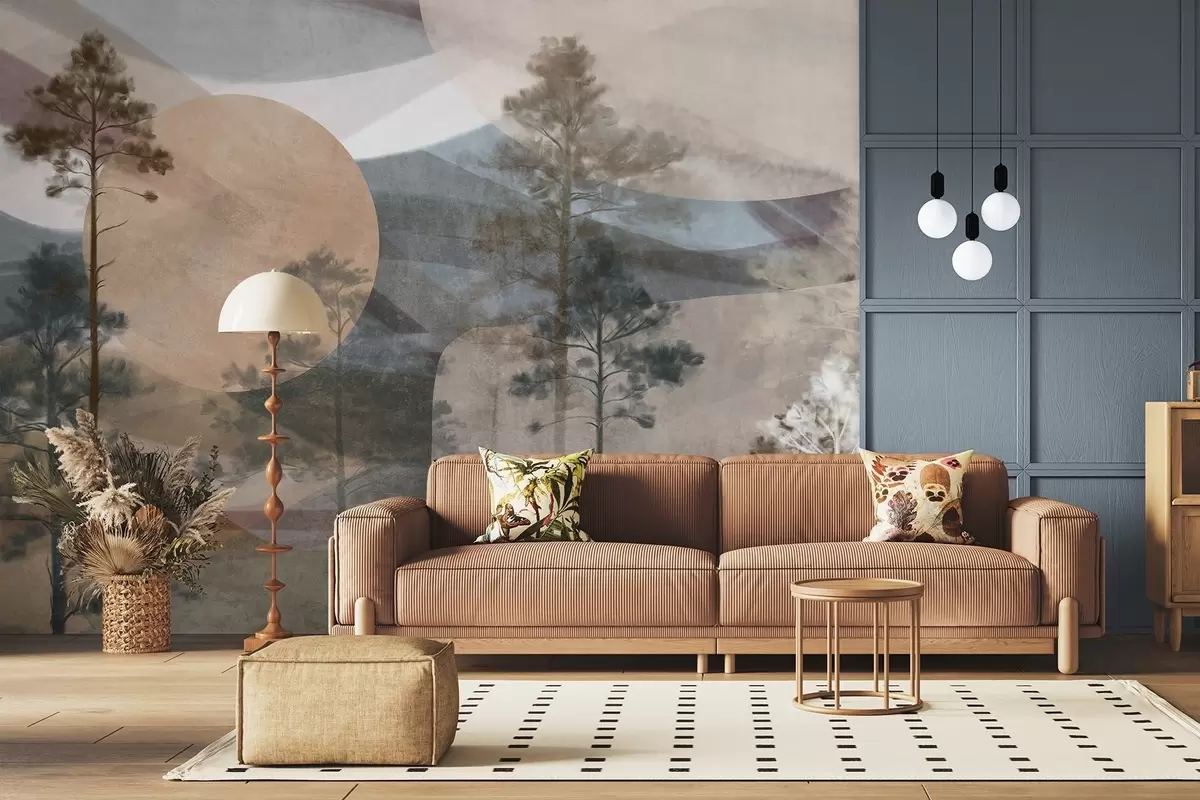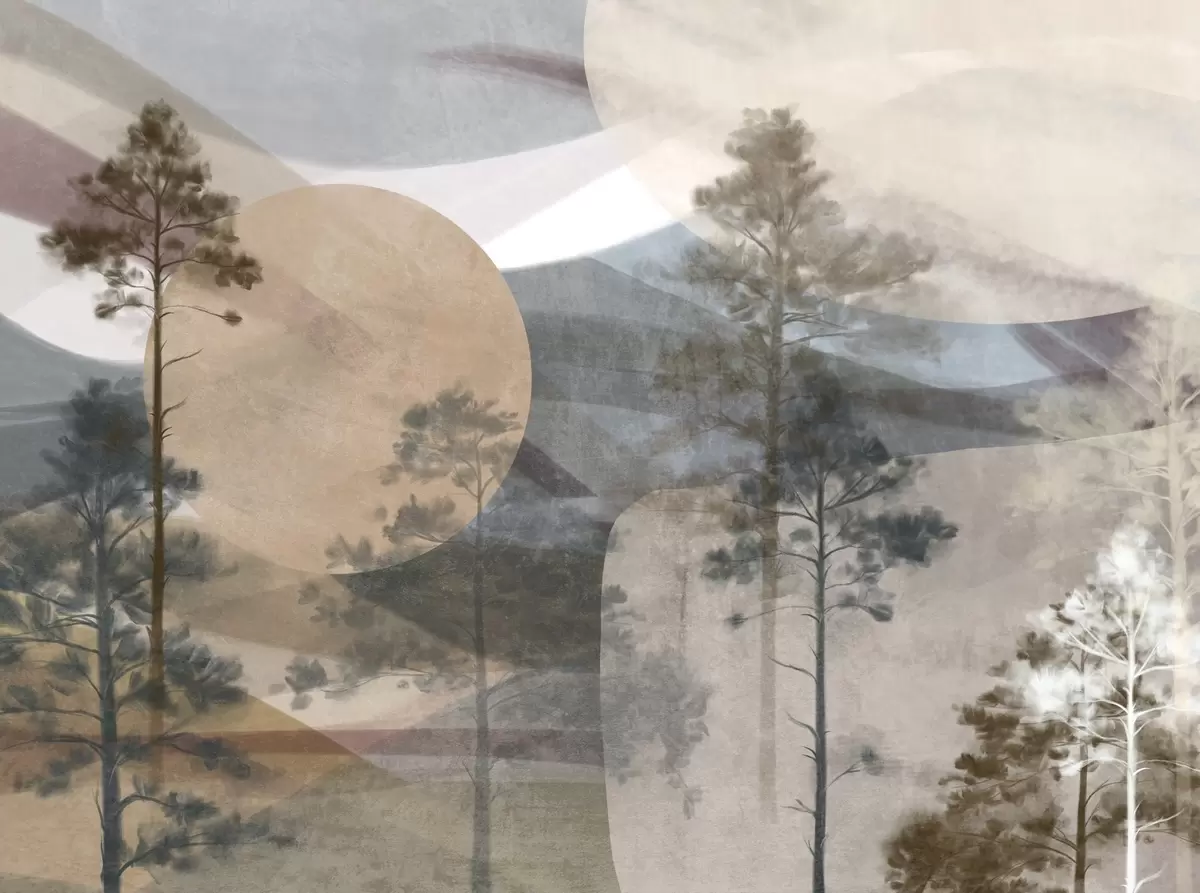 Tall pine trees in a muted textured landscape with abstract circular shapes and layered mountains in earthy tones - Wall mural (No. w09636)