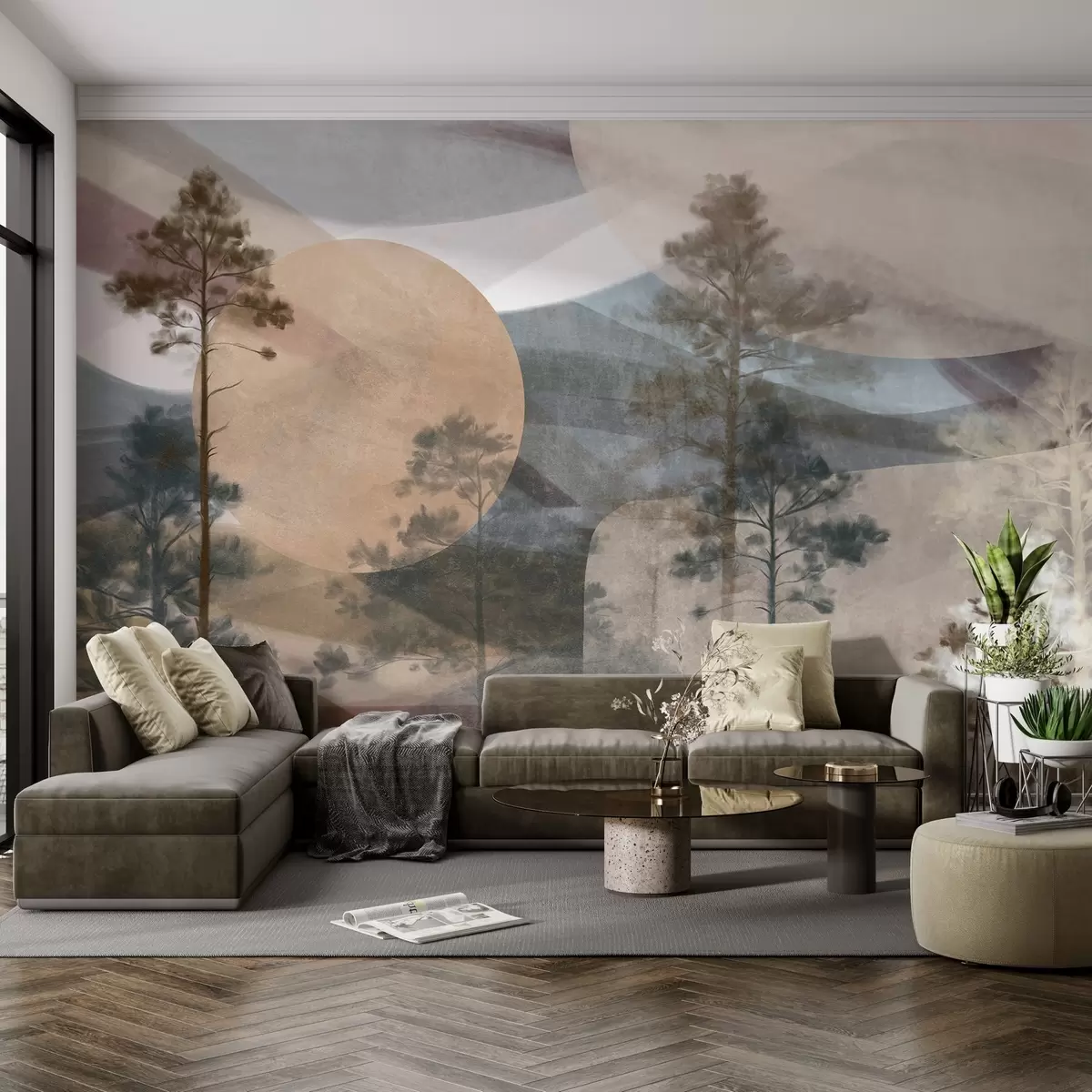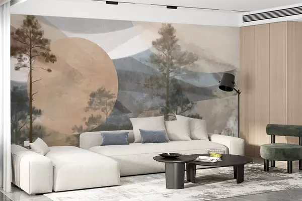 Tall pine trees in a muted textured landscape with abstract circular shapes and layered mountains in earthy tones - Wall mural (No. w09636)