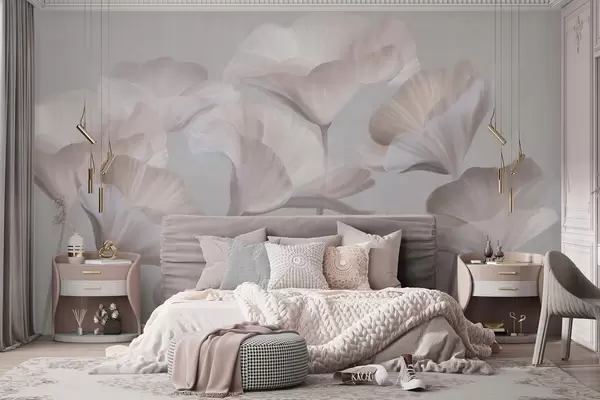 Pale peach textured translucent lotus flowers with delicate petals against a muted gray background - Wall mural (No. w09640)