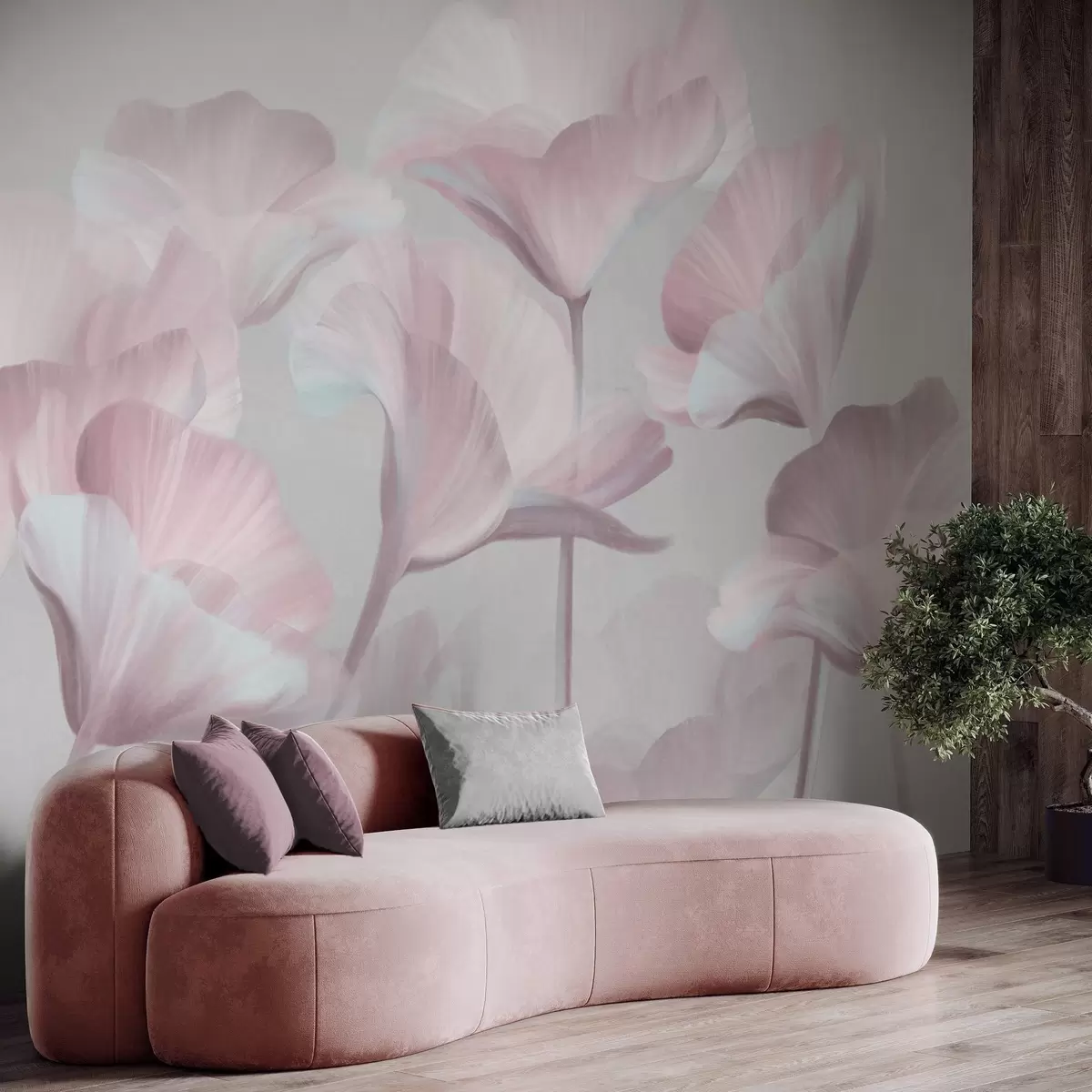 Pale pink textured translucent lotus flowers with delicate petals against a muted gray background - Wall mural (No. w09640v1)