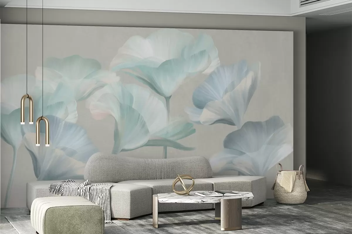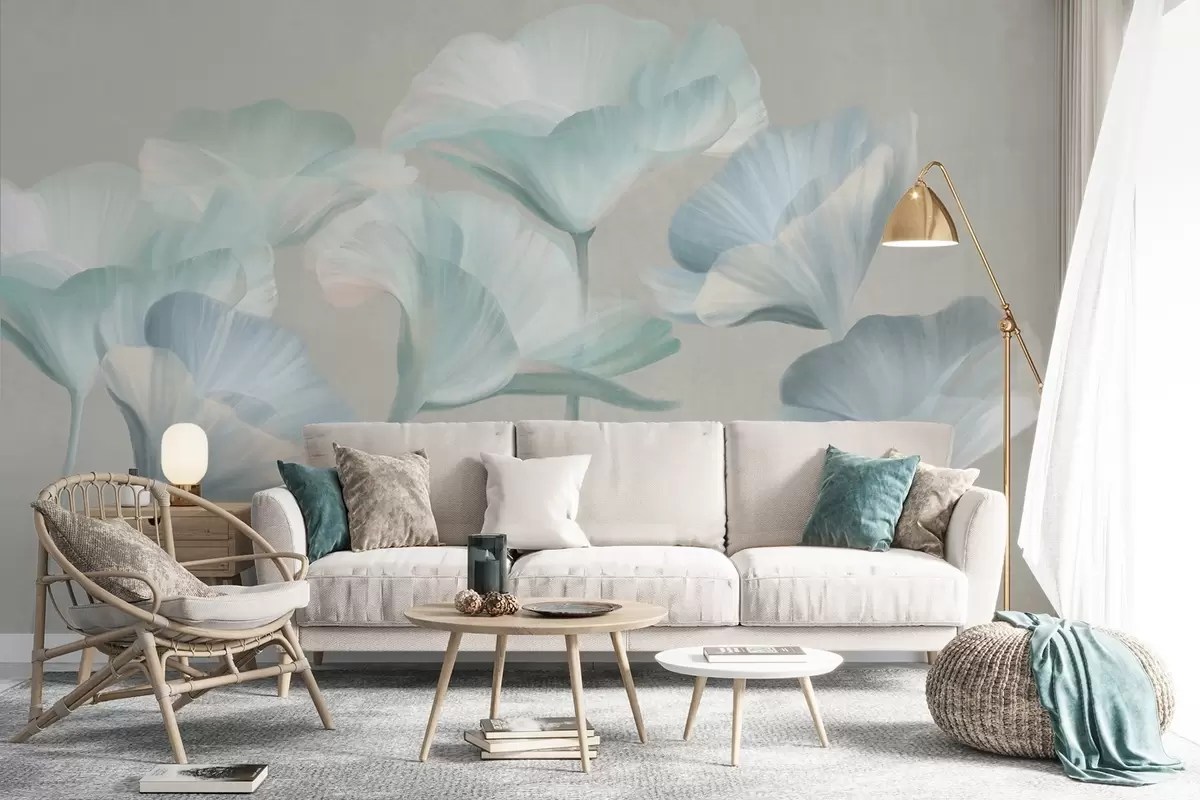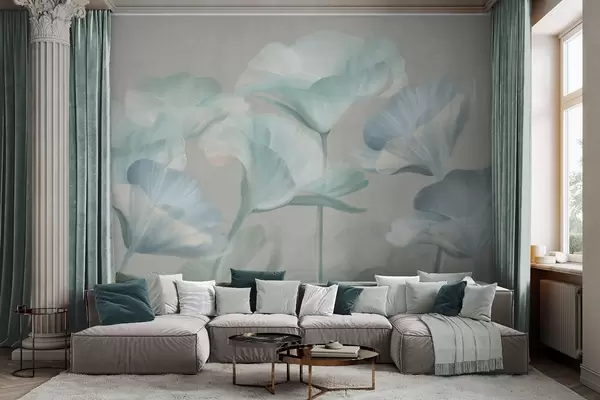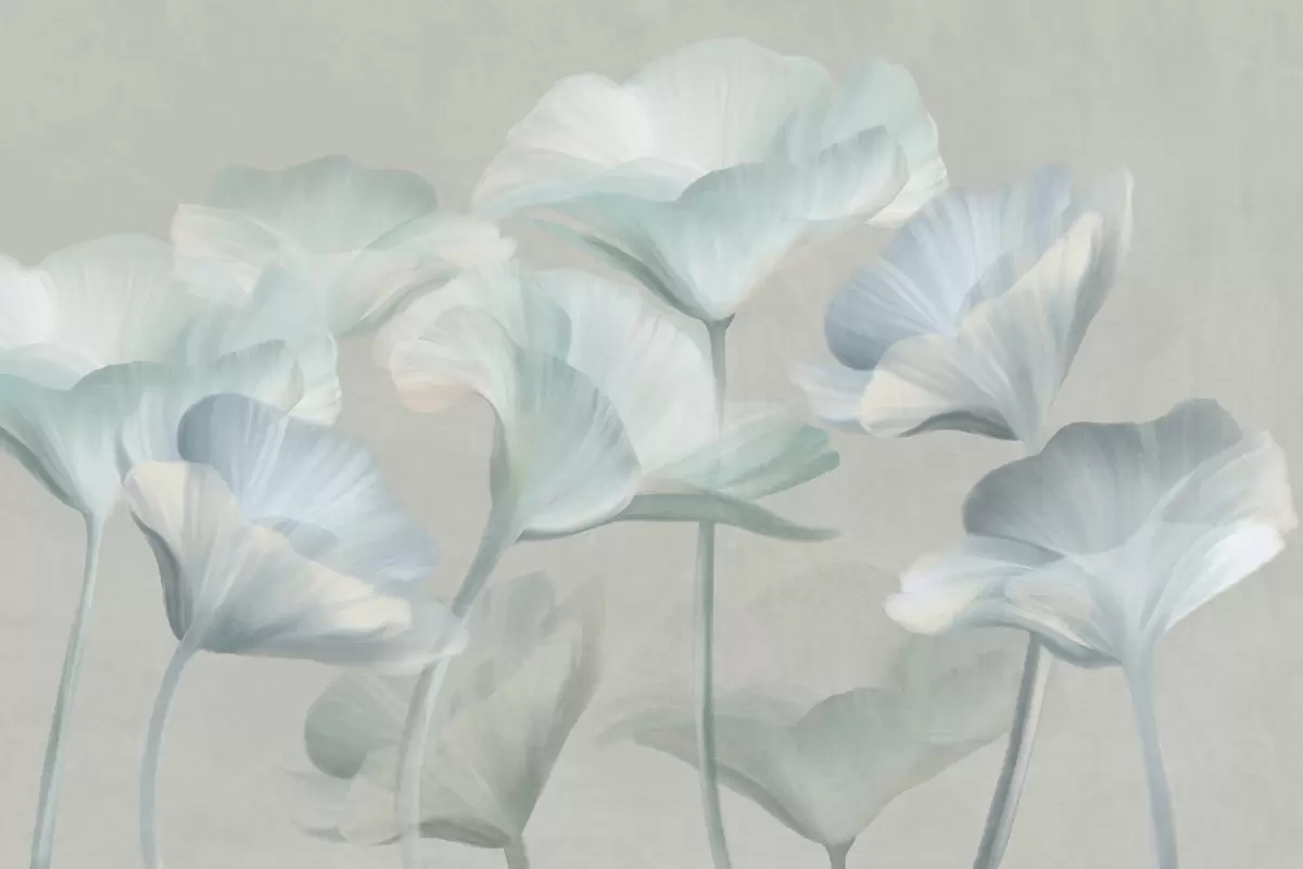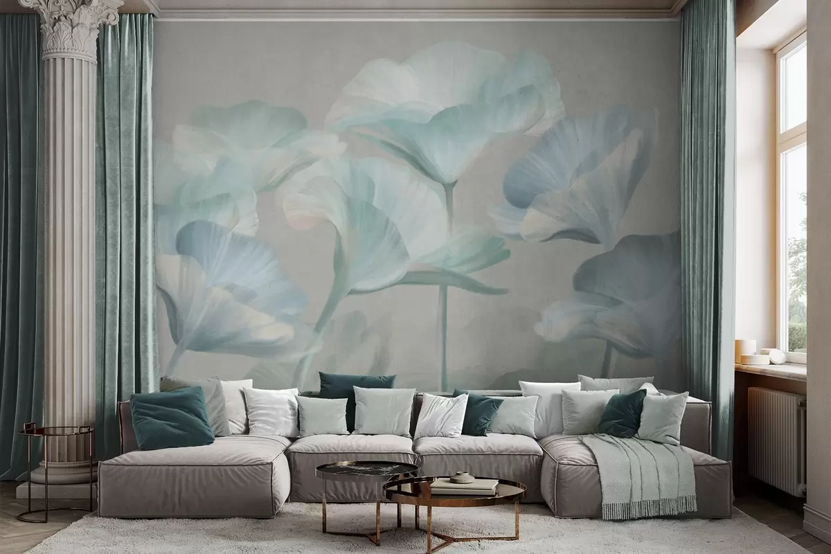Pale turquoise textured translucent lotus flowers with delicate petals against a muted gray background - Wall mural (No. w09640v2)