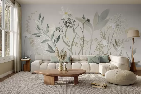 Delicate textured wildflowers and foliage in muted green and cream tones against a soft beige background - Wall mural (No. w09641)