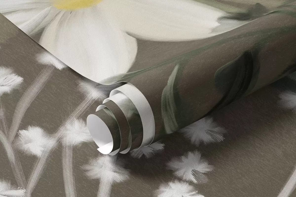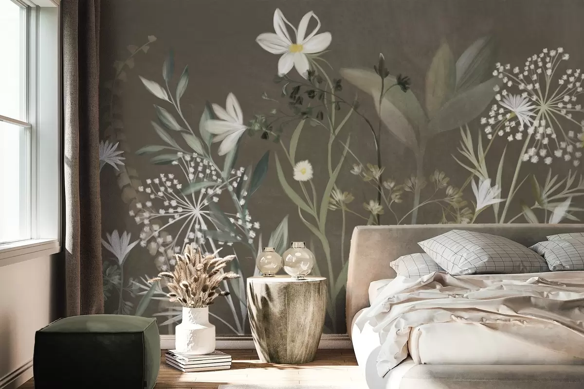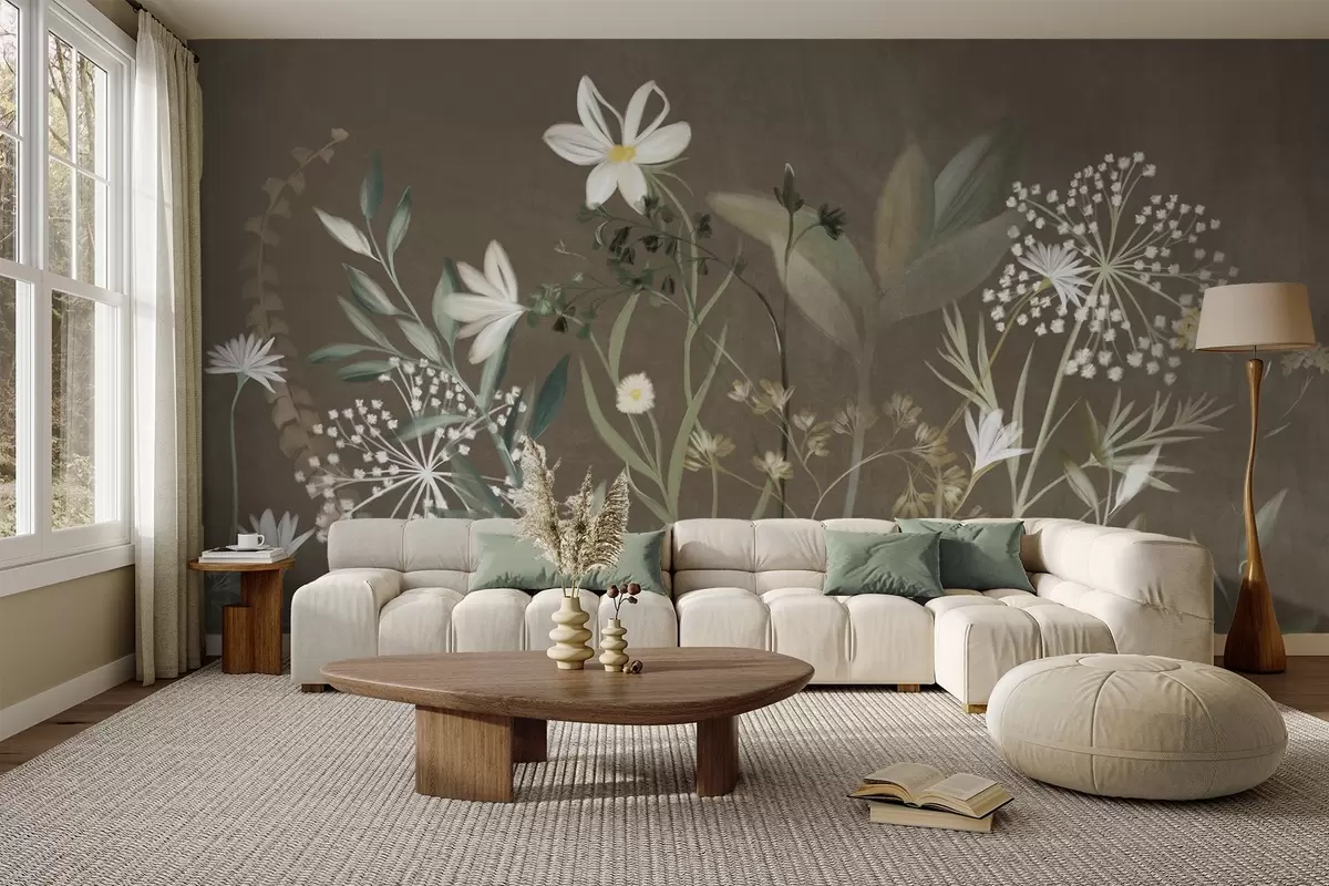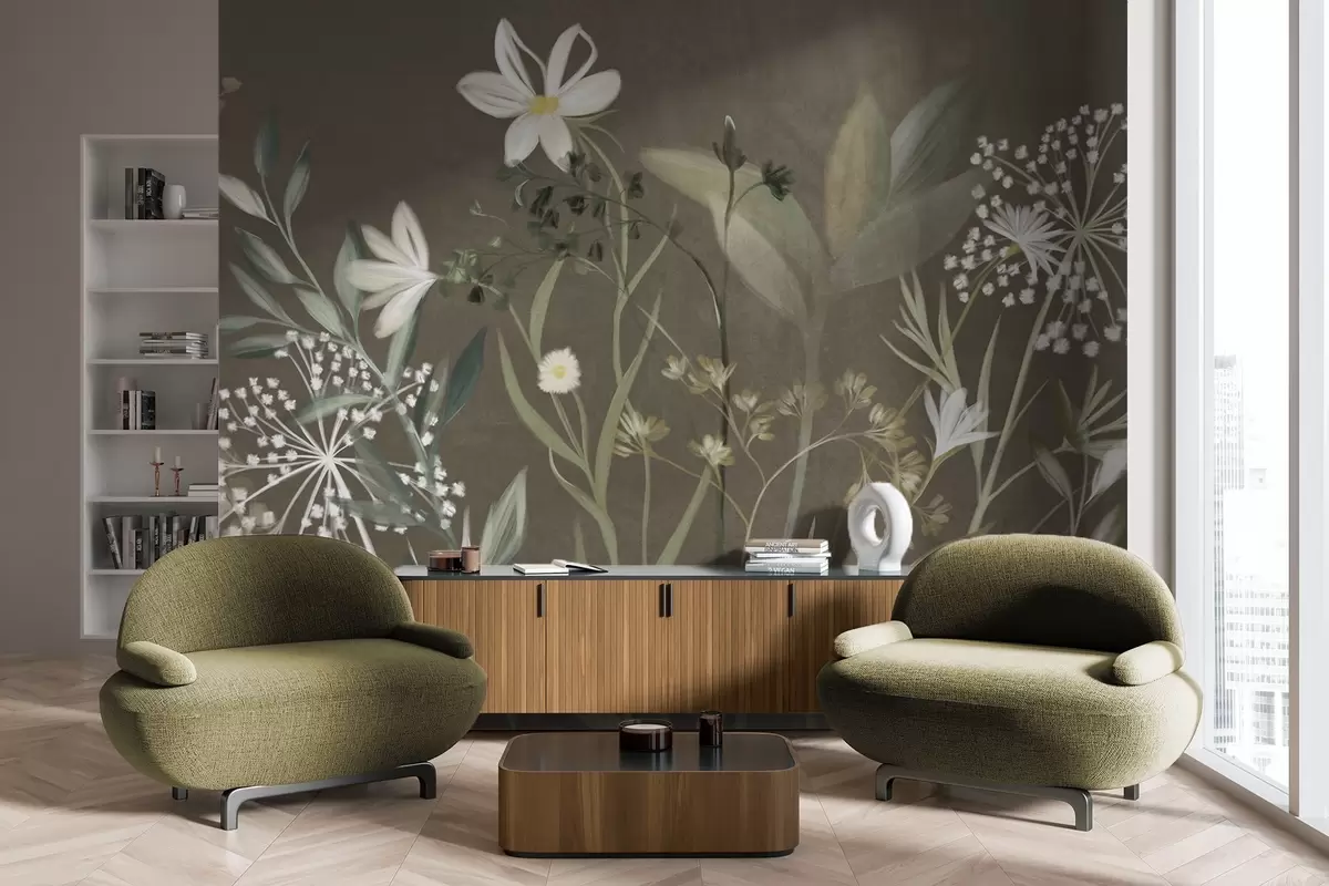 Delicate textured wildflowers and foliage in muted green and cream tones against a brown background - Wall mural (No. w09641v1)