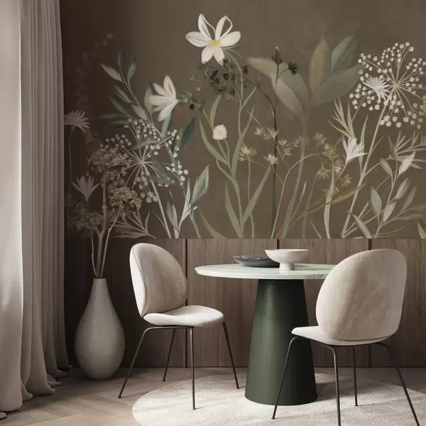 Delicate textured wildflowers and foliage in muted green and cream tones against a brown background - Wall mural (No. w09641v1)