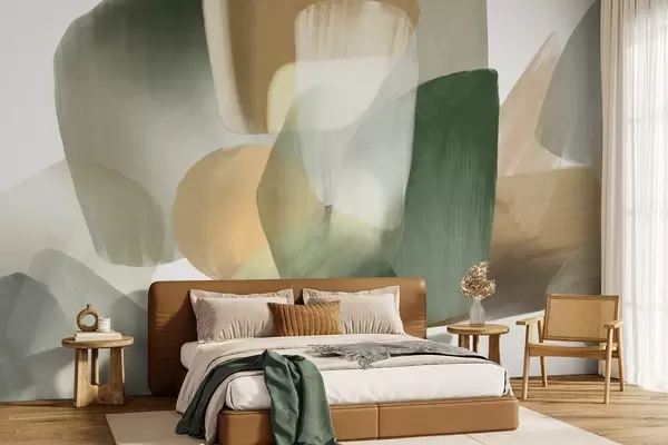 Abstract texrured shapes in muted green and beige colors, with soft edges and overlapping layers - Wall mural (No. w09642)