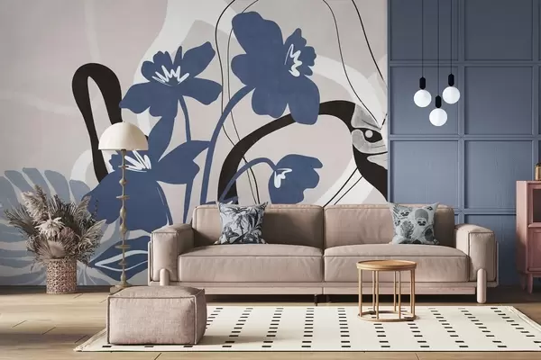 Abstract textured blue flowers with white and black shapes against a light beige background, minimalist art - Wall mural (No. w09645)