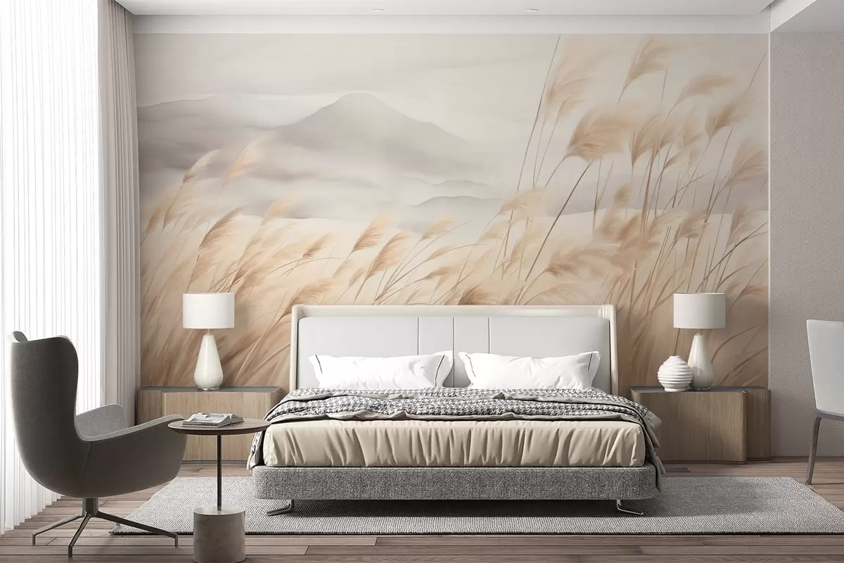 Textured mountain landscape with tall, dry grass under a hazy sky - Wall mural (No. w09649)