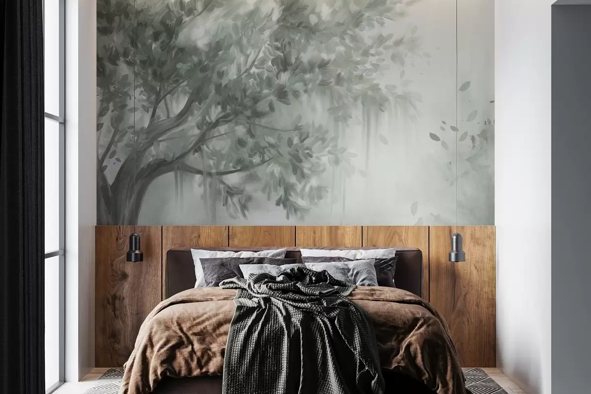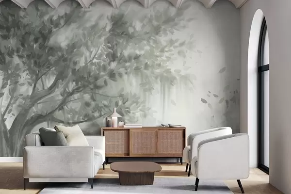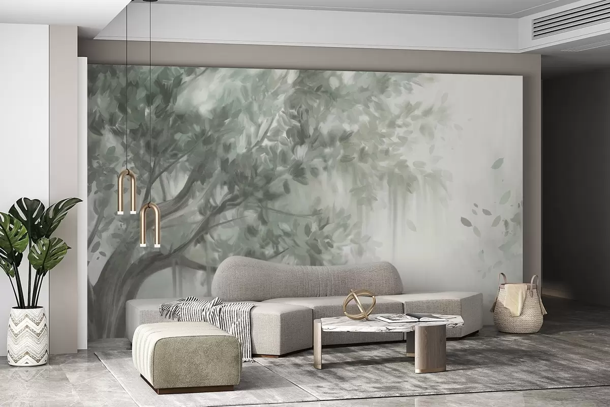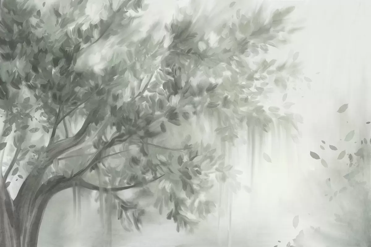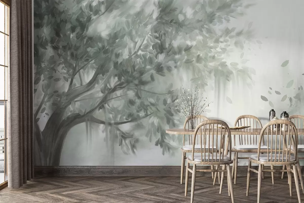Textured tree with green leaves and branches, with a soft, hazy background - Wall mural (No. w09650v1)