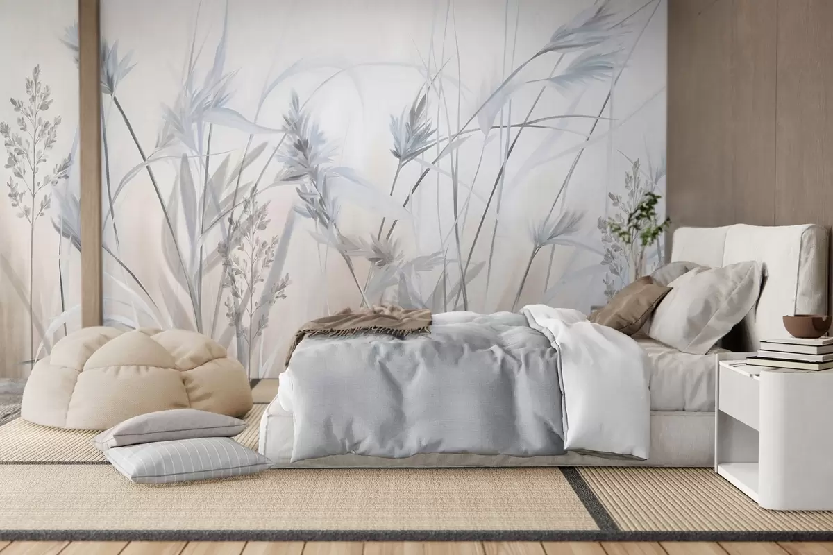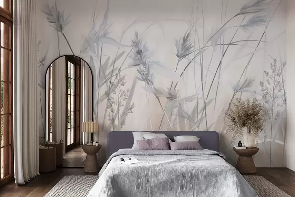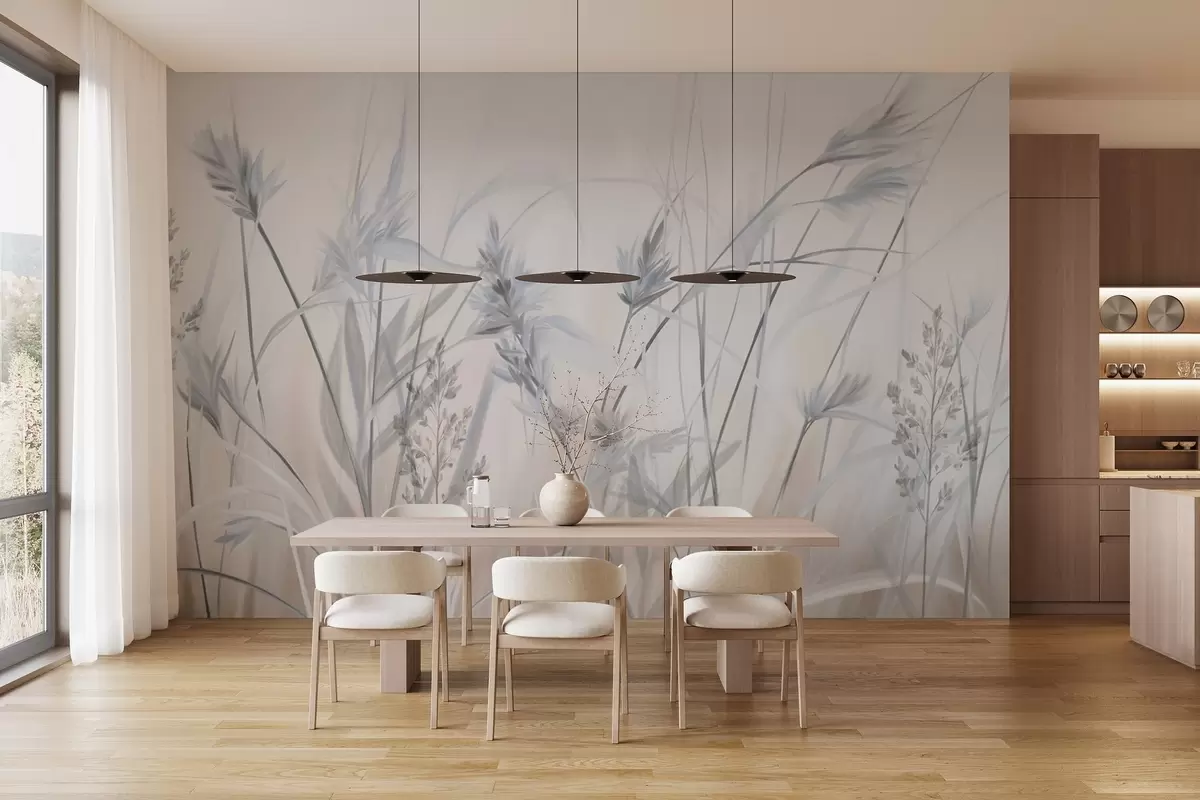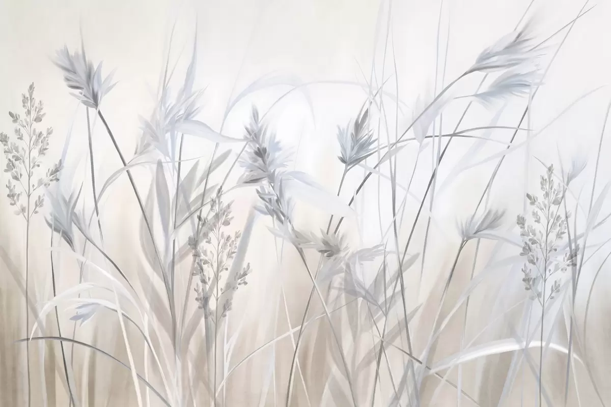 Tall, dry grass stalks with feathery tops in muted tones, soft, hazy white and beige background - Wall mural (No. w09652v1)